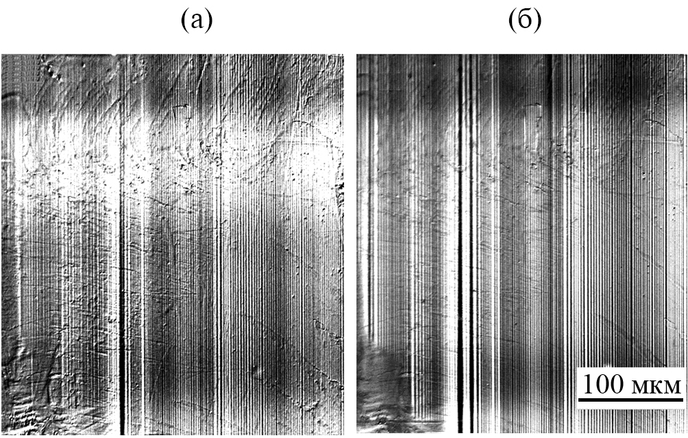 Рис. 3. Появление продольной и поперечной модуляций яркости изображения двойниковой структуры ромбической фазы (напряжений) при температуре: а – 186.2; б – 33 К (контраст изменен, чтобы одновременно визуализировать и модуляцию, и двойниковую структуру). Видно, что положение двойниковых границ практически неизменно в широком диапазоне температур.