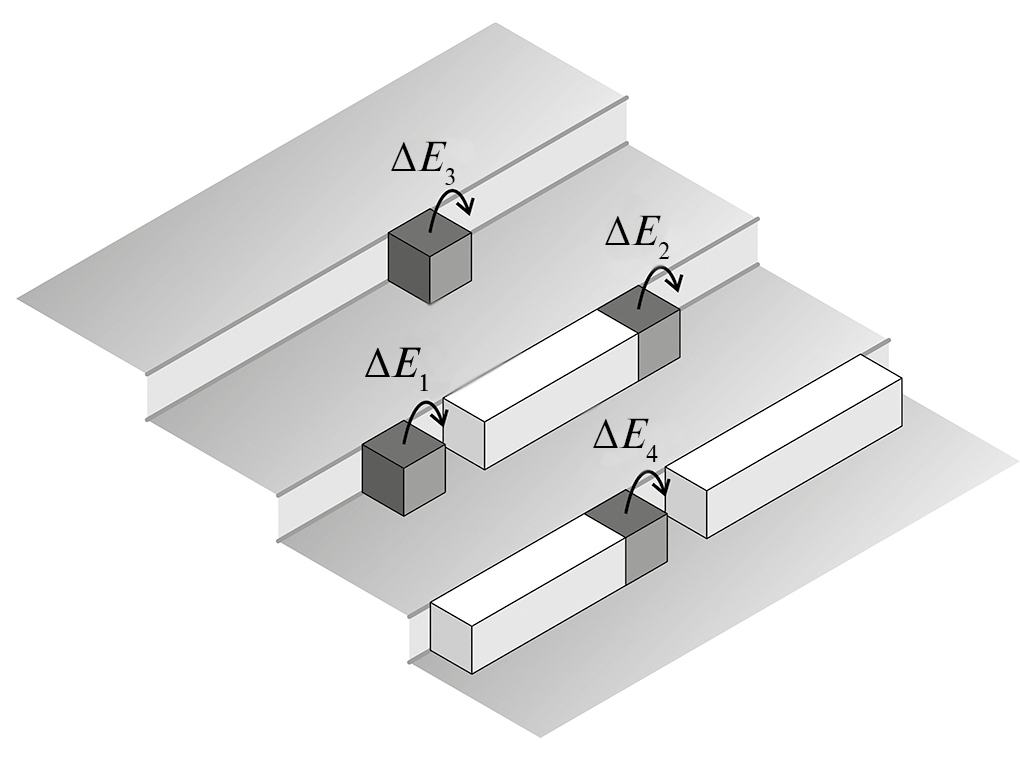 Моделирование формирования одномерных наноструктур на ступенчатых металлических поверхностях было проведено кинетическим методом Монте-Карло [14, 15]. Взаимодействия адатомов между собой и с поверхностью рассматривали в рамках следующей модели. Основными событиями были: прыжок атома к сформировавшейся цепочке (диффузионный барьер ΔE1), отсоединение атома от цепочки (ΔE2), движение адатома по поверхности вдоль ступени (ΔE3), а также блуждание вакансии по цепочке (ΔE4). Схематично перечисленные события изображены на рис. 1. Частоты переходов, соответствующие данным событиям, определяли, используя уравнение Аррениуса:
