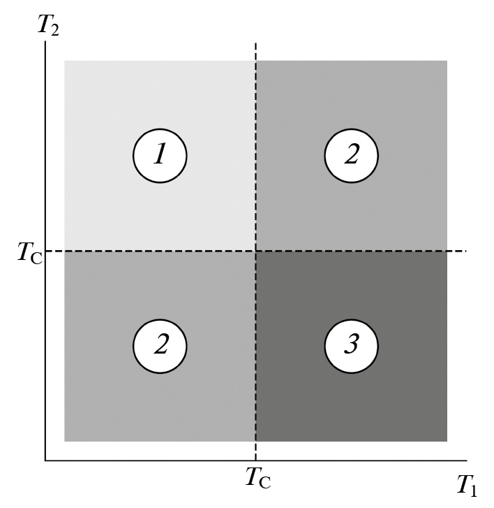Рис. 3. Диаграмма распределения длин наноцепочек в зависимости от начальной (T1) и конечной (T2) температуры: 1 – нагрев образца, средняя длина увеличивается; 2 – распределение не изменяется; 3 – охлаждение образца, средняя длина наноструктур уменьшается. TC – критическая температура