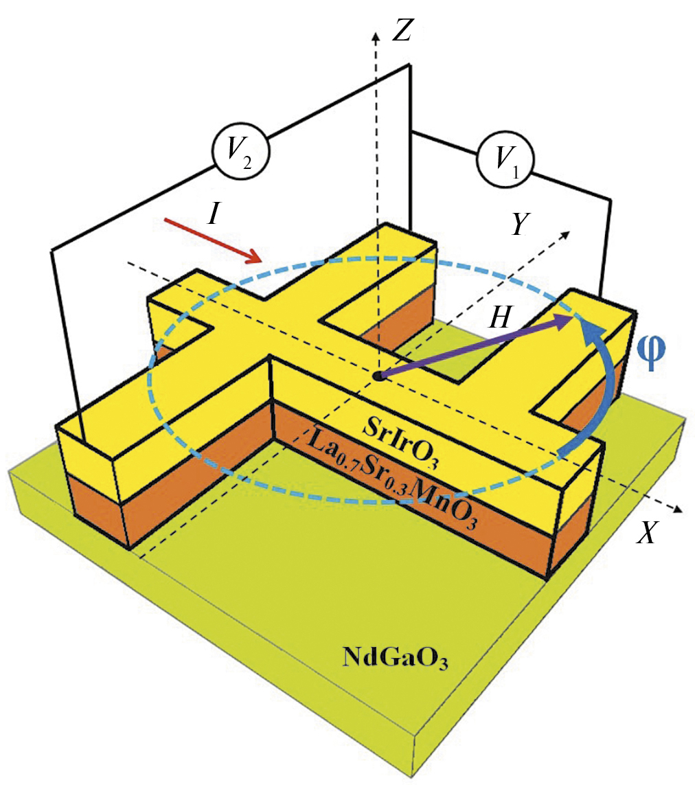 Соотношение между зарядовым током jQ, который измеряется в эксперименте, и спиновым током jS определяется спиновым углом Холла θSH [2, 14] jQ = 2eθSH[n × jS]/ћ, где n – единичный вектор направления спинового момента. Для определения значения θSH образцу SrIrO3/La0.7Sr0.3MnO3 придавали особую планарную форму (рис. 4). Измеряли напряжение VL, пропорциональное продольному магнитосопротивлению, и VT – пропорциональное поперечному магнитосопротивлению (фактически, холловскому сопротивлению). Вдоль направления X (рис. 4) задавали ток I = 0.5 мА на частоте f = 1.1 кГц. Для измерения напряжения использовали чувствительный синхронный усилитель. Подложку с образцом вращали вокруг нормали к плоскости образца для изменения угла φ между магнитным полем H и током I, лежащими в плоскости подложки. Магнитосопротивление RL(T) определяли делением напряжения VL(T) на ток I. Измеряли магнитно-полевые зависимости нормированного изменения магнитосопротивления ΔR/R0 = (R – R0)/R0 гетероструктуры SrIrO3/La0.7Sr0.3MnO3 (R0 – магнитосопротивление при H = 0) при изменении угла φ между магнитным полем H и током I. Полученные значения сравнивали с данными для пленок La0.7Sr0.3MnO3 и гетероструктур Pt/La0.7Sr0.3MnO3.