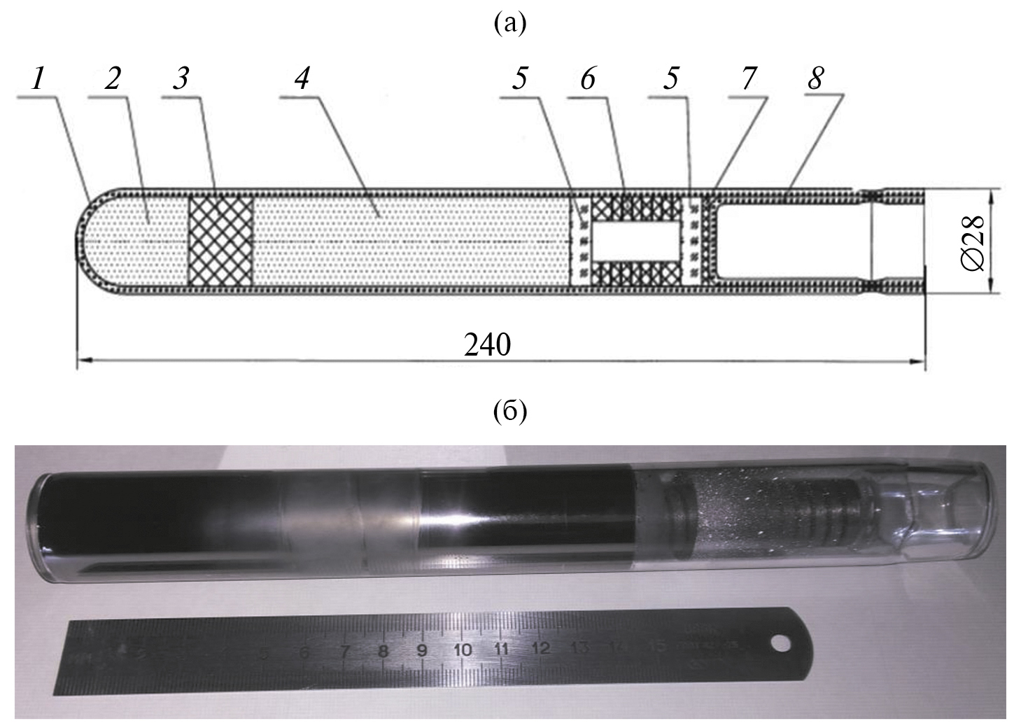 Рис. 2. Ампула для выращивания кристаллов в условиях микрогравитации: а) – сборочный чертеж: 1 – ампула, 2 – затравка, 3 – зона растворителя, 4 – питающий слиток, 5 – вставка, 6 – пружина, 7 – наполнитель, 8 – пробка; б) – общий вид с загрузкой после сборки и герметизации