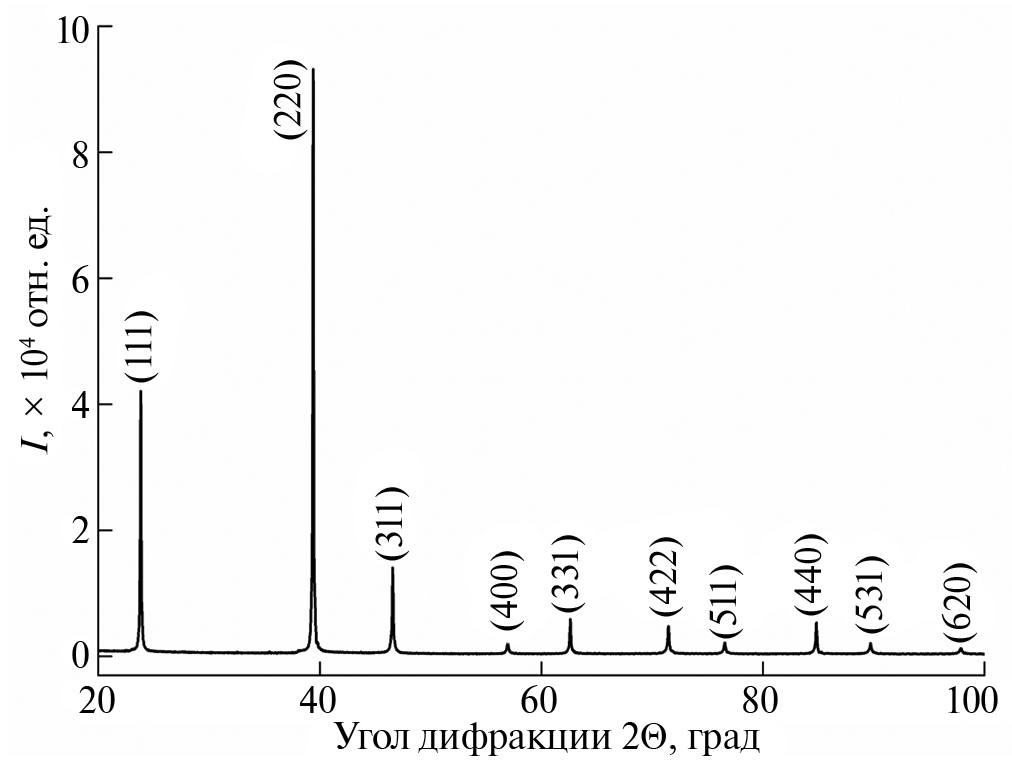 Для синтеза исходных материалов использовали Cd, Zn и Te высокой чистоты (99.9999%). Исходные компоненты в соответствующих пропорциях смешивали и помещали в кварцевую ампулу, которую затем откачивали до остаточного давления 0.13 Па. Запаянные ампулы помещали в горизонтальную трубчатую печь при комнатной температуре и выводили в режим синтеза следующим образом: до температуры плавления теллура (~450°С) скорость нагрева была ~25°С/ч, затем скорость нагрева уменьшали до 10°С/ч; нагрев проводили до ~1110°С и выдерживали при этой температуре 24 ч. Затем проводили охлаждение до комнатной температуры со скоростью 20°С/ч. Из полученной шихты в графитовых тиглях методом вертикальной зонной плавки под давлением аргона 10 МПа со скоростью 5 мм/ч и градиентом температуры на фронте 30°С/см вытягивали монокристаллы, ориентированные вдоль <110>.