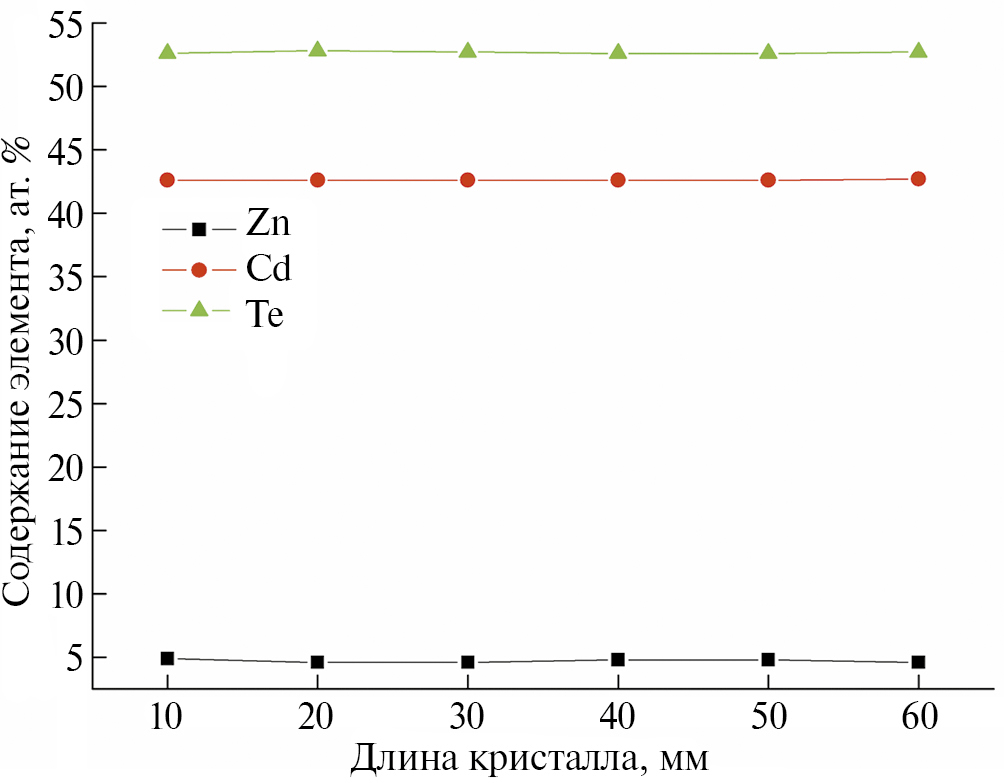 Для контроля состава материалов, предназначенных для затравки, растворителя и питающего слитка было проведено исследование элементного и фазового состава. Из данных на рис. 3. видно, что кристалл представляет собой твердый раствор Zn в CdTe. Распределение элементов по оси роста показано на рис. 4. Также состав материалов контролировали оптически по ширине запрещенной зоны. Для этого была проведена съемка спектров пропускания образцов в видимом диапазоне (рис. 5). Ширина запрещенной зоны при комнатной температуре для образцов состава Cd0.96Zn0.04Te и Cd0.9Zn0.1Te составляет 1.53 и 1.57 эВ соответственно. Плотность дислокаций в среднем на уровне 103 см–2. Это существенно меньше обычного значения в этих кристаллах [21].