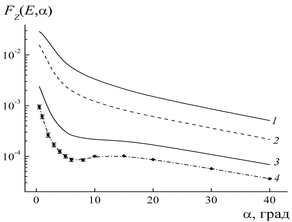 Во всем диапазоне углов падения коэффициент отражения F(E, α) превышает несколько процентов. При увеличении угла падения α коэффициент отражения F(E, α) монотонно возрастает и стремится к единице при скользящих углах падения α → 90°. Уменьшение коэффициента F(E, α) с увеличением энергии E в области небольших α объясняется уменьшением потока электронов в поверхностных слоях мишени. Коэффициент отражения при падении электронов вдоль нормали к поверхности F(E, α = 0) уменьшается при увеличении энергии электрона (рис. 1). Эта особенность характерна для всех материалов от бериллия до урана [7]. Количество электронов, отраженных углеродной мишенью с энергией E < 50 кэВ, превышает 5% во всем диапазоне углов падения.