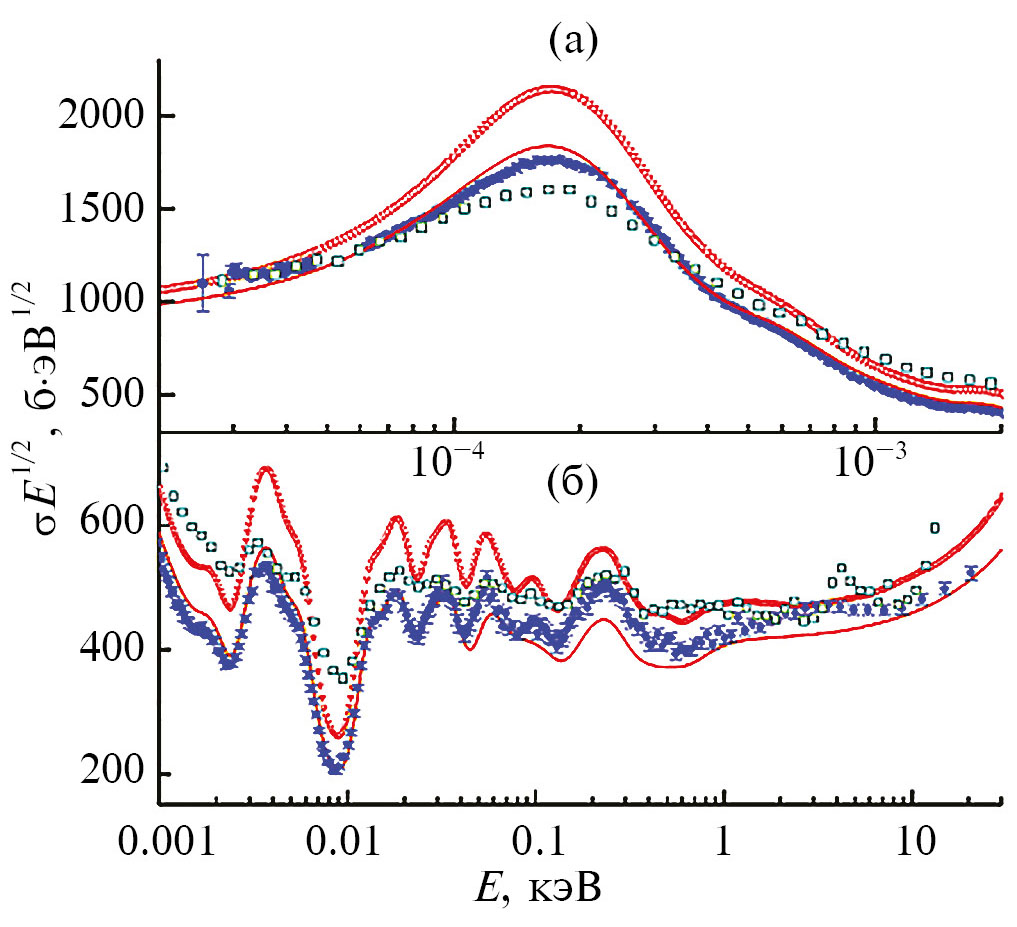 В области энергии выше 1 эВ данные измерений на СВЗ-100 [13] (рис. 5) заметно расходятся с результатами, полученными на спектрометре KULS [35]. Данные СВЗ-100 имеют более четкую резонансную структуру с существенно более глубокими провалами на кривой сечения. Площадь под пиком при энергии 1.41 эВ в 1.5 раза больше, чем в случае KULS. В случае СВЗ-100 нет пика при энергии 708 эВ в отличие от KULS. Уровень фонового сечения в данных СВЗ-100 заметно ниже.