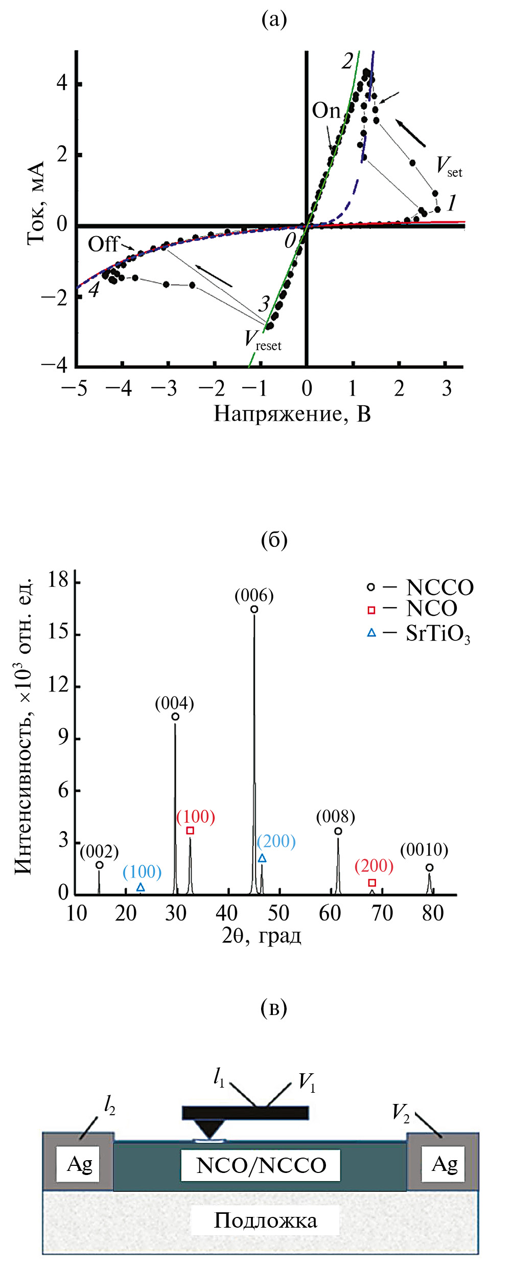 Рис. 1. Пример ВАХ гетерофазного образца Ag/NCO/NCCO/STO микроконтактного типа (а); рентгенограмма двухфазной пленки NCCO/NCO (б); схема микроконтактной структуры с указанием токовых (I1, I2) и потенциальных (U1, U2) контактов (в)