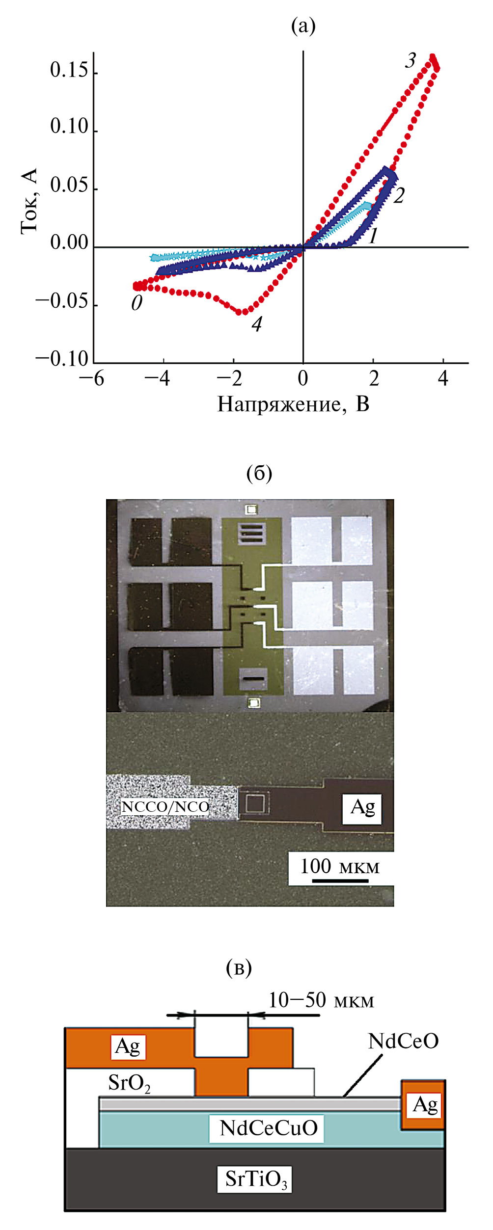 Рис. 2. Пример ВАХ гетерофазного образца Ag/NCO/NCCO/STO литографического типа. Развертка напряжения была по направлениям ветвей: 0–1–2–3–4–0 (а); изображение (б) и профиль (в) образца, сформированного литографией