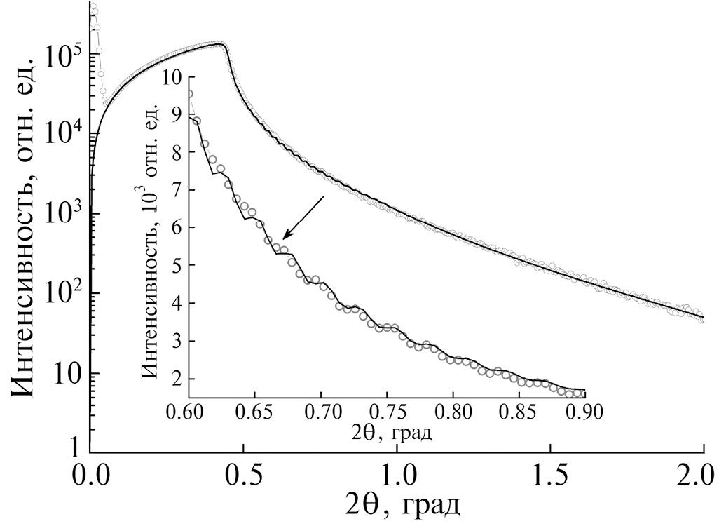 На рис. 1 показаны результаты анализа исходной структуры КНИ методом малоугловой рентгеновской рефлектометрии. Точками показан результат эксперимента, линией – расчет кривой по модели со слоем кремния на подложке из оксида кремния. Подгонка расчета модели под эксперимент является стандартным подходом к обработке данных рентгеновской рефлектометрии, ее проводили с помощью программного комплекса Bruker Diffrac.Leptos. Расхождение вблизи 0° вызвано попаданием первичного пучка напрямую в детектор, что не учитывается при моделировании, так как не оказывает влияния на определяемые параметры пленок и точность подгонки. По результатам подгонки определена толщина приборного слоя кремния – 260 нм. Ширины верхнего и нижнего переходных слоев составляют 2 нм. Эти значения учитывали при расчетах режимов имплантации ионов, а также для пересчета времени травления методом ВИМС в глубину. Контроль толщины приборного слоя и ширины переходных слоев с помощью ВИМС проводили в дальнейшем также в случае отожженных структур для оценки диффузионного перемешивания на границах раздела.