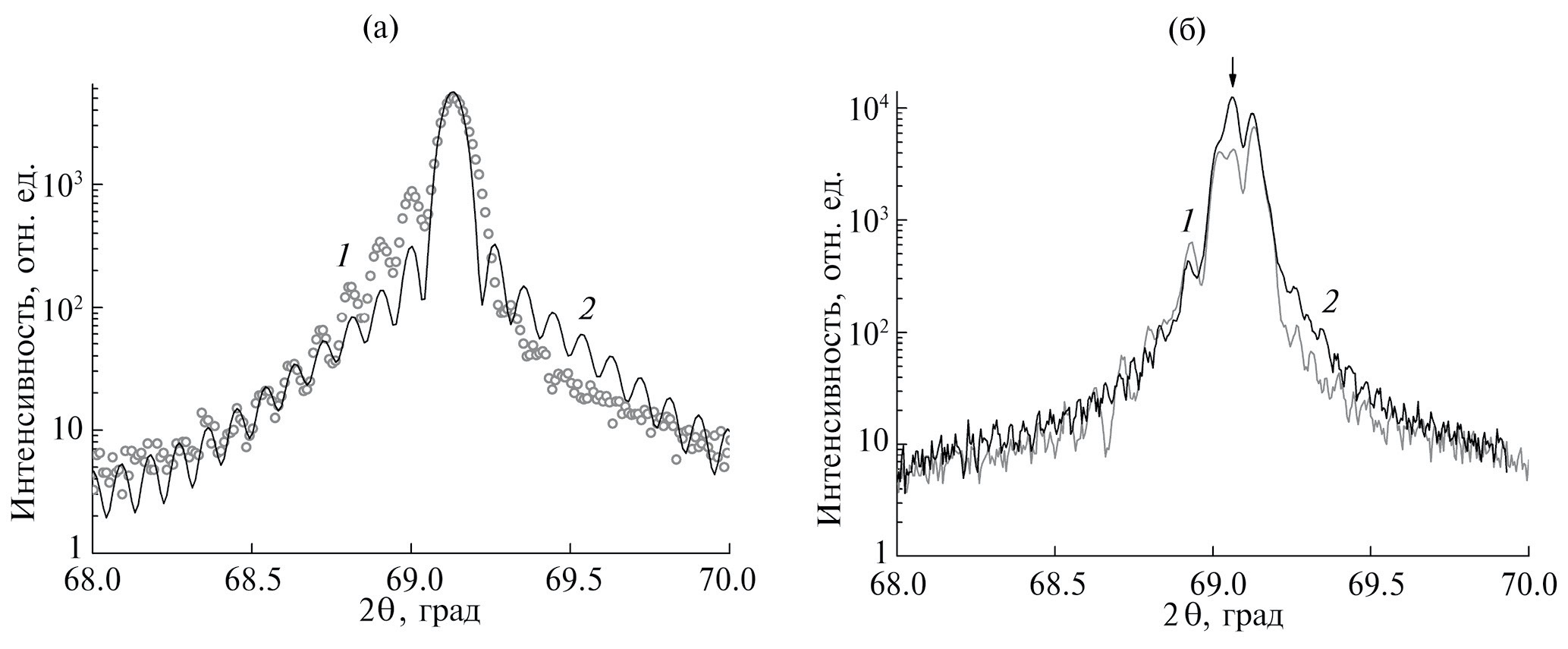 Рис. 6. Рентгенодифракционный анализ структуры КНИ: а – после имплантации бора с предаморфизацией ионами фтора (1 – эксперимент, 2 – подгонка); б – после отжига в режимах 1 (1) и 2 (2), пик деформированного слоя кремния (деформация сжатия) помечен стрелкой