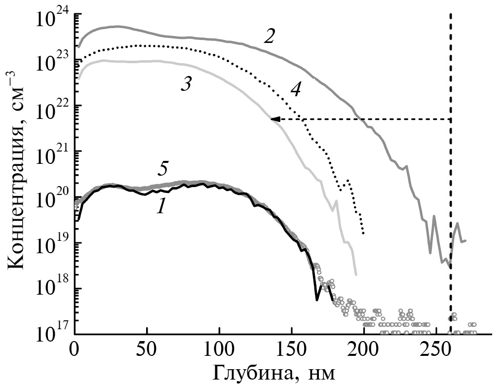 Рис. 4. Результаты расчета с помощью SRIM (1–4) и ВИМС (5) в случае легирования бором: 1 – распределение бора после имплантации (1.5 × 1015/20 + 4 × 1014 5); 2 – номинальное распределение вакансий в приборном слое кремния, вызванных облучением ионами аргона (2 × 1015/100 + 2 × 1015/30); 3 – номинальное распределение вакансий после облучения ионами аргона (6 × 1014/70 + 2 × 1014/15); 4 – номинальное распределение вакансий после облучения ионами фтора (3 × 1015/35); 5 – распределение бора после имплантации. Пунктиром показана толщина приборного слоя Si в структуре, стрелкой – уровень, при котором согласно расчету [26] наступает аморфизация кремния