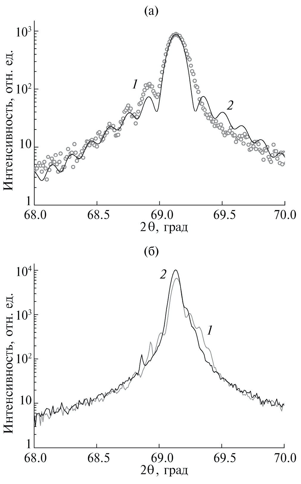 Рис. 5. Рентгенодифракционный анализ структуры КНИ: а – после имплантации бора с предаморфизацией ионами аргона (1 – эксперимент, 2 – подгонка); б – после отжига в режимах 1 (1) и 2 (2)