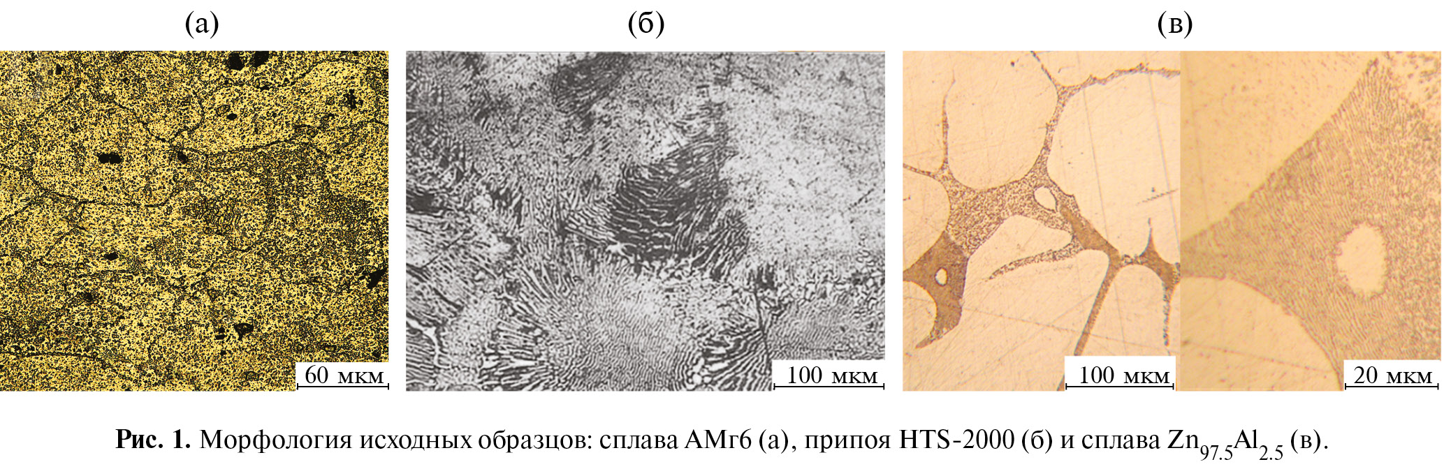 Для исследований использовали пластины сплава АМг6, вырезанные из листов, выполненных по ГОСТ 21631; припой HTS-2000 с химическим составом 95.5 ат. % Zn, 2 ат. %Cu, 2.5 ат. % Al в виде сплюснутых прутков с попеченным сечением размером d ~ 2–4 мм и слитки модельного сплава Zn97.5Al2.5.