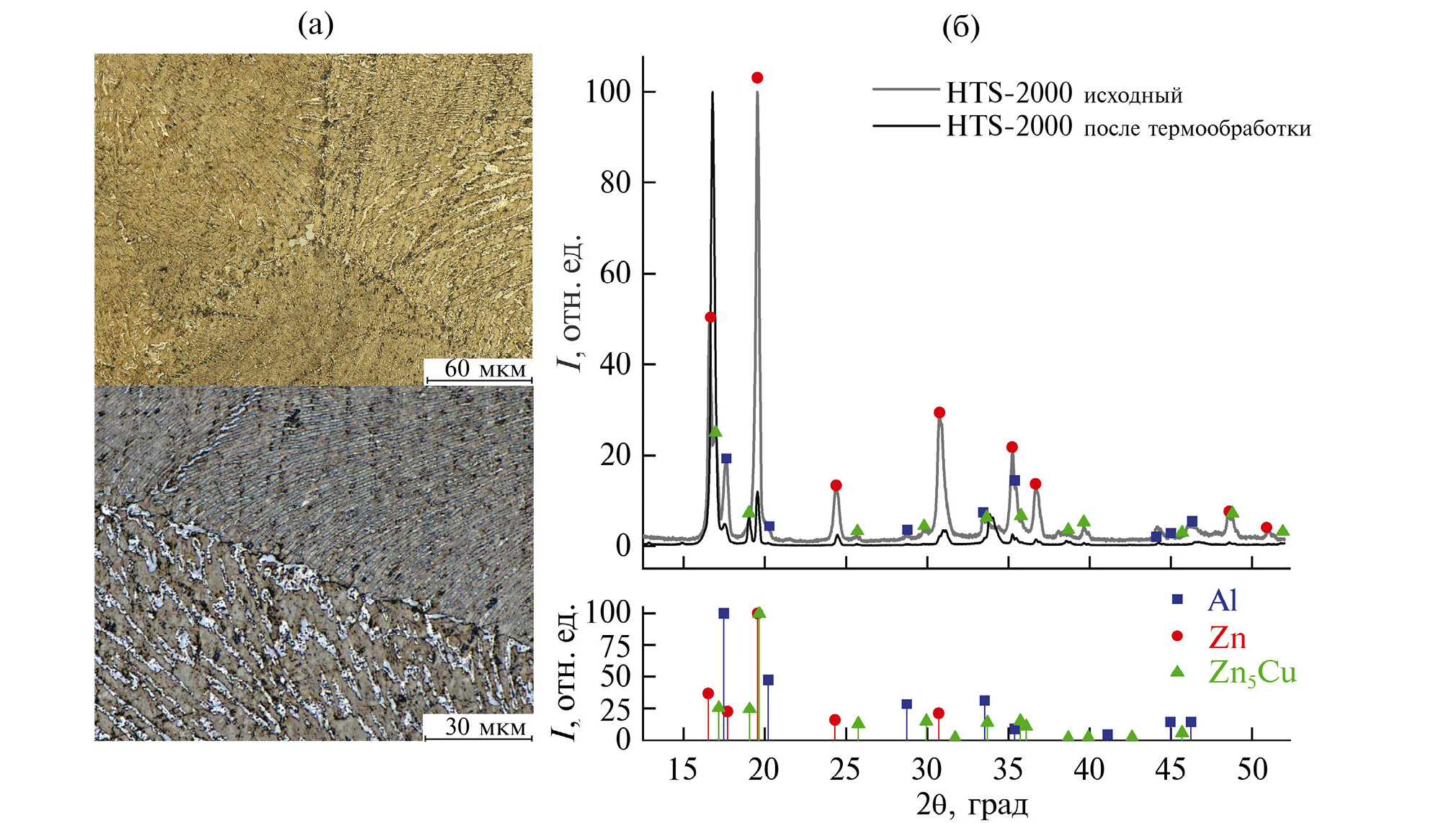 На рис. 6г–6е представлена структура наплавки припоя HTS-2000 на подложку после ТО2. Повышение времени выдержки до 2 мин не приводит к принципиальным изменениям в структуре наплавленного слоя, но наблюдается небольшое увеличение доли эвтектики. Распределение компонент по структуре, наблюдаемое на изображениях композита после термообработки, приведено на рис. 7а. Светлые области на рис. 7б содержат Zn и Cu и соответствуют твердому раствору β и фазе Zn5Cu, а темные области содержат примерно равное количество Al и Zn и соответствуют распаду первичных кристаллов фазы α на α1/α.