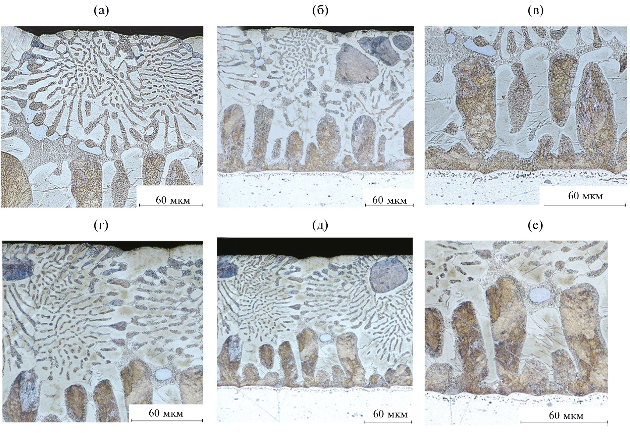 На рис. 6а–6в представлена структура исследуемых композитов после термообработки в режиме ТО1. Из анализа морфологии видно, что после температурной выдержки слой наплавки припоя, по сравнению со слоем после лужения, увеличивается почти в три раза. Это обусловлено высокой активностью Zn, который диффундирует в материал матрицы и снижает температуру плавления АМг6. При температурной выдержке происходит подплавление материала матрицы, и тем самым увеличивается зона взаимодействия припой–подложка, а также содержание Аl и Mg в образующемся расплаве. В результате при медленном охлаждении (v = 10°С/мин) на границе с подложкой формируются столбчатые кристаллы твердого раствора α и крупные эвтектические колонии фазы α + β. Размеры столбчатых кристаллов твердого раствора составляют от 70 до 110 мкм.