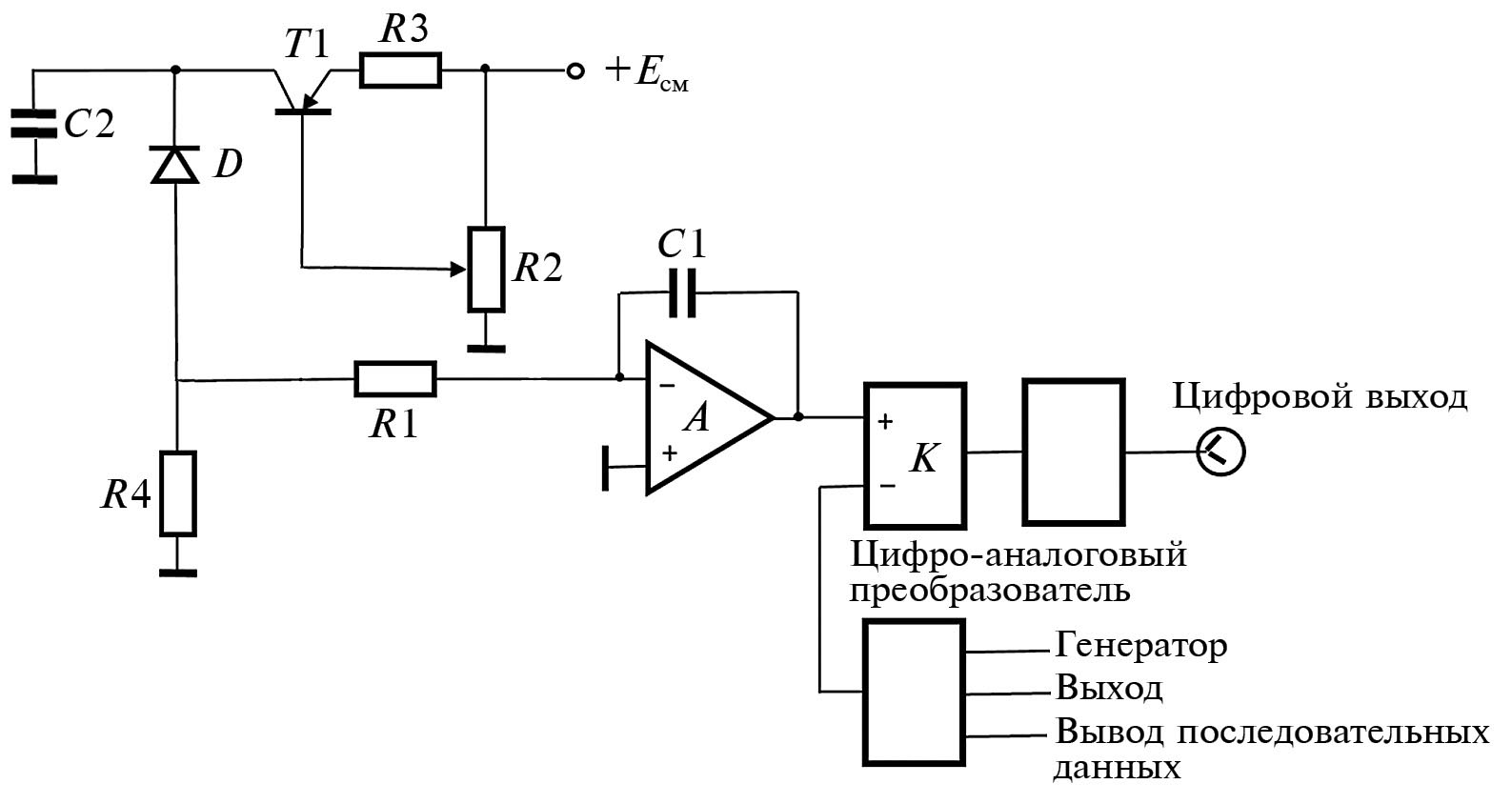 В предложенном варианте схемы смещения вместо резистора R2 включен транзистор T1 с функцией жесткого контроля напряжения рабочей точки кремниевого фотоумножителя Uр.т. (рис. 5). Резистор R1 задает напряжение рабочей точки кремниевого фотоумножителя. Резистор R2 задает ток заряда конденсаторов C2 и C3. При регистрации фотонов кремниевым фотоумножителем на резисторе R4 формируется положительный сигнал. После регистрации фотонов зарядка ячеек фотоумножителя происходит по линейному закону, а не логарифмическому и, следовательно, за гораздо меньшее время (менее 200 нc). Расчет времени зарядки конденсатора T можно выполнить по формулам (1) и (2):