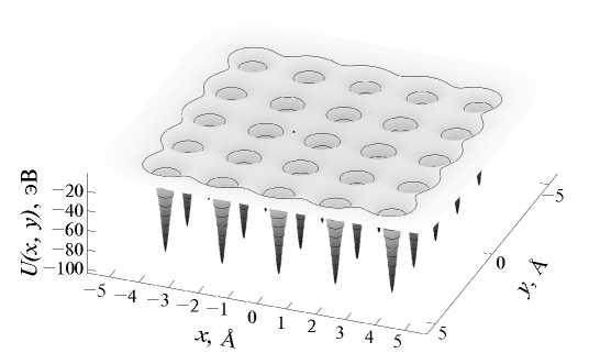 Рис. 1. Потенциальная энергия (7) электрона, движущегося вблизи направления [100] кристалла кремния.