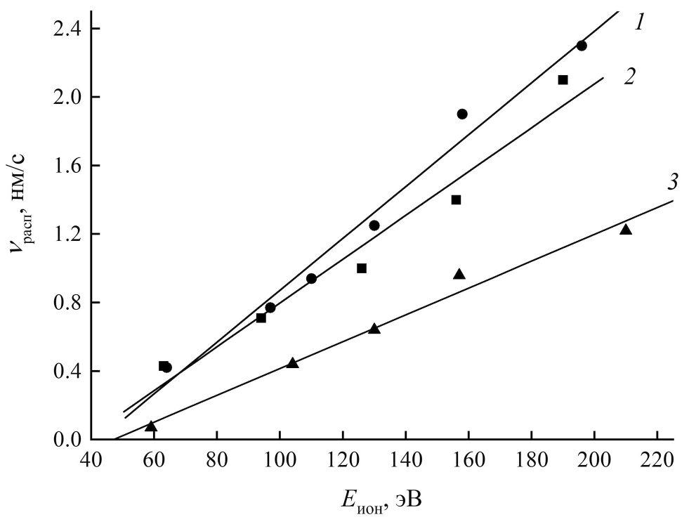Рис. 1. Экспериментальные зависимости скорости распыления пленок Al (1), AК1 (2) и Si (3) от средней энергии ионов Ar+.