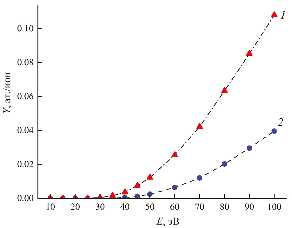 Следует отметить, что при облучении образцов ионами плазмы ВЧ-разряда мощность смещения Wсм, подаваемая на держатель образцов, определяет среднюю энергию бомбардирующих ионов Eион. В [18, 24] показано, что энергетическое распределение ионов плазмы ВЧ-разряда на мишень является бимодальным, т.е. имеет два максимума. Поэтому может наблюдаться распыление образцов ионами плазмы со средней энергией, близкой к пороговым значениям [19].