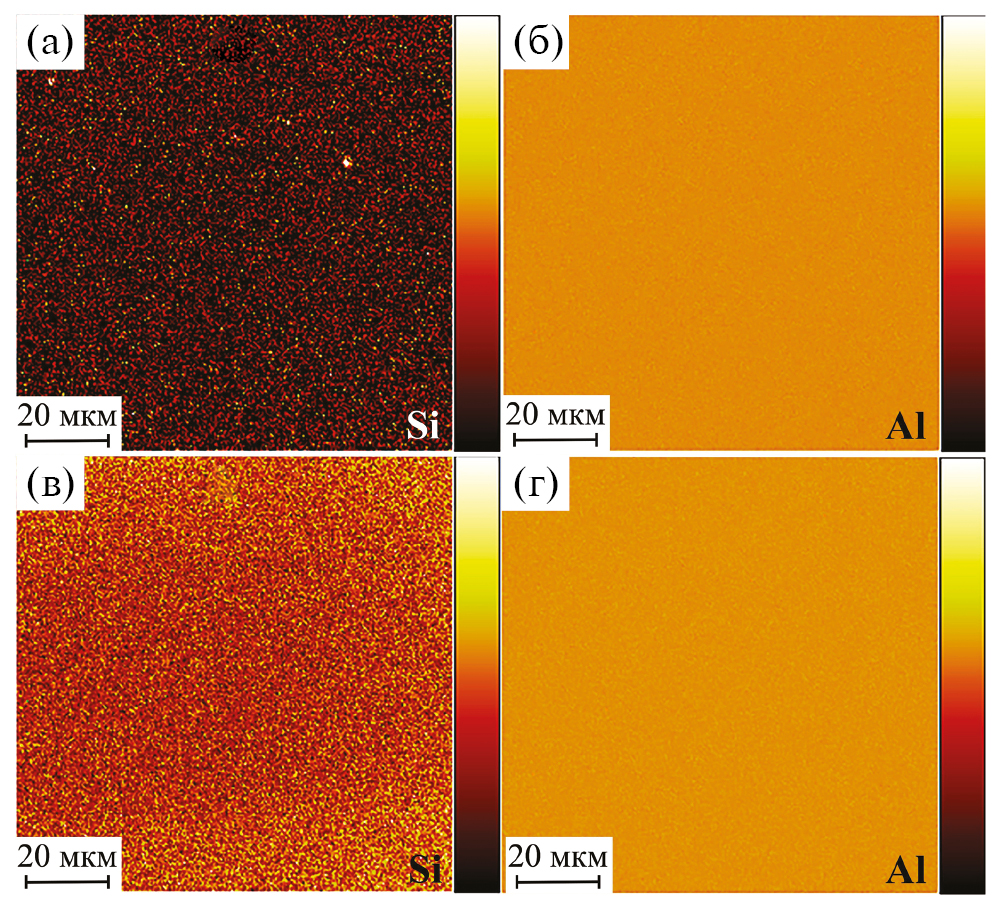 Подтверждением этого предположения могут быть изображения исходной и обработанной в плазме поверхностей АК1, полученные методом вторичной ионной масс-спектрометрии на установке IONTOF5 с использованием вторичных ионов Si+ и Al+ (рис. 4). Яркость полученных изображений пропорциональна регистрируемым токам вторичных ионов. На рис. 4а можно наблюдать отдельные яркие точки источников вторичных ионов Si+. Поэтому можно предположить, что выделяющиеся холмы на рис. 3а являются зернами Si. Действительно, об этом свидетельствует возросшая яркость изображения поверхности, полученная с использованием вторичных ионов Si+ (рис. 4б). В исходной пленке АК1 отношение интегральных токов вторичных ионов Si+ к Al+ составляет 0.7 × 10–2. После облучения ионами Ar+ с энергией 45 эВ в течение 6 мин оно стало (при неизменном токе вторичных ионов Al+) 1.5 × 10–1. То есть ток вторичных ионов Si+ увеличился практически в 20 раз, что свидетельствует о значительном росте концентрации кремния на поверхности пленки. Более подробный анализ химического состава поверхности исходной и обработанных в плазме пленок был выполнен методами растровой электронной оже-спектроскопии и ВИМС. Однако увеличение плотности наноструктур на поверхности пленок и яркости изображения, полученного с использованием вторичных ионов Si+, после ионно-плазменной обработки позволяет предположить, что эти холмы представляют собой выделившиеся преципитаты Si.