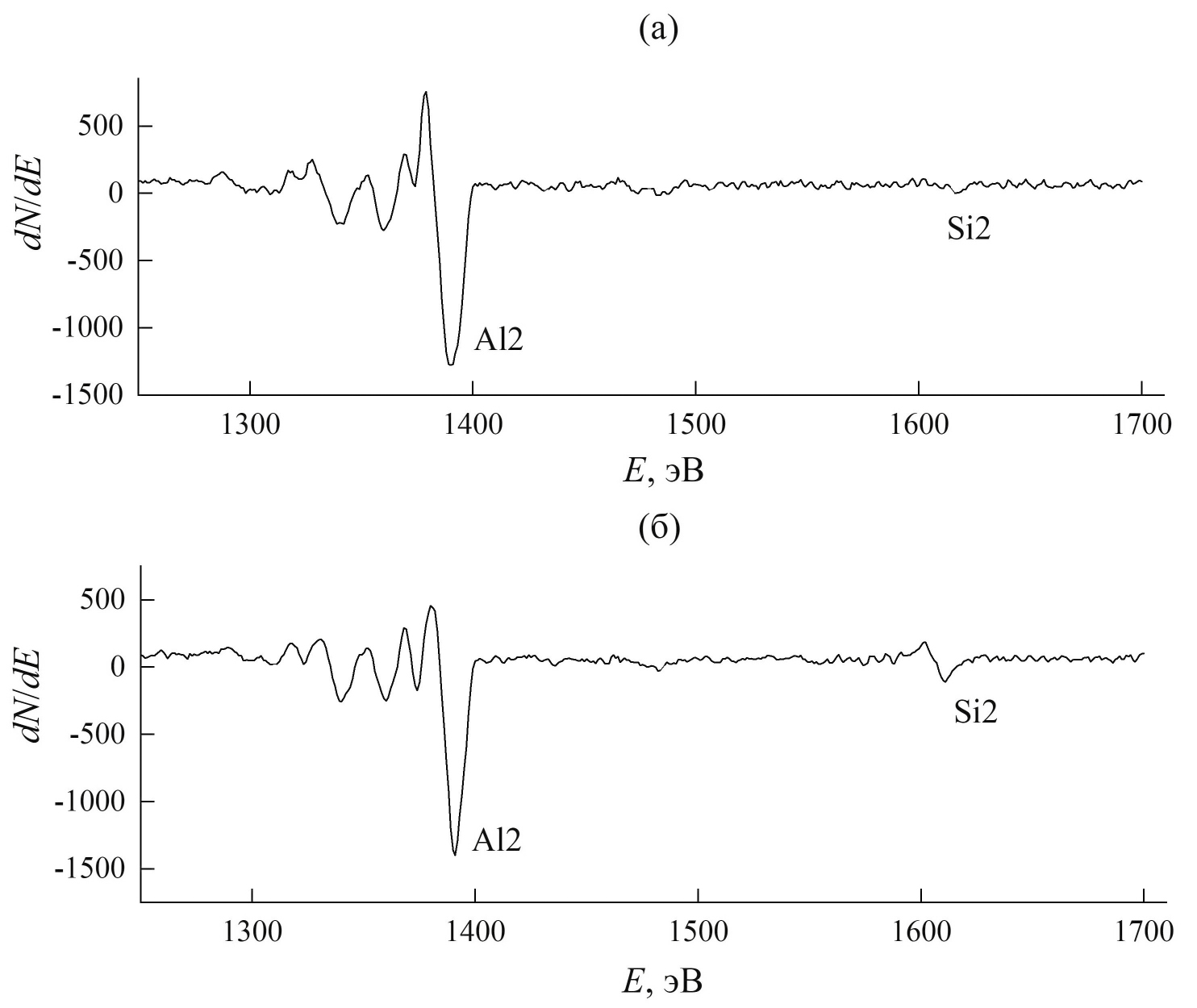 Методом оже-спектроскопии оценено отношение концентраций Al и Si по отношению величин высокоэнергетических оже-пиков этих элементов с учетом коэффициентов относительной чувствительности (рис. 5). Следует отметить, что толщина модифицированных слоев пленки не превышала нескольких нанометров, поэтому перед проведением оже-анализа поверхность не очищали ионной бомбардировкой. По этой причине спектры содержали большие низкоэнергетические пики C, N, O, которые затрудняли выделение пика Si в этой области спектра. В исходных пленках отношение оже-сигналов IAl/ISi ~18–19, что соответствует концентрации Si на поверхности пленки менее 4%. После распыления пленок ионами с энергией 60 эВ отношение IAl/ISi изменилось до ~4–5, что соответствует увеличению концентрации Si на поверхности до 20–25%.