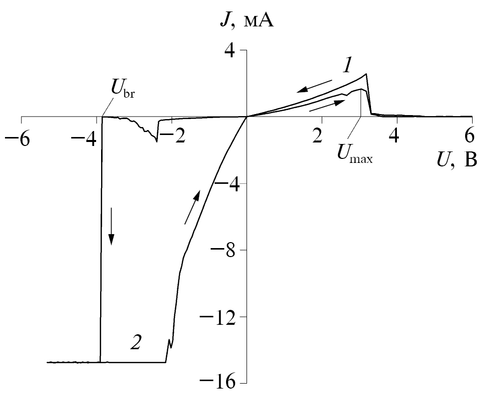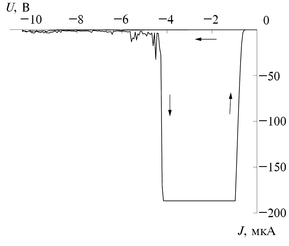 Электроформовка включала помещение структур в высокий вакуум (с остаточным давлением менее 10–2 Па, поскольку наличие кислорода в газовой среде при больших давлениях подавляет процесс электроформовки) и подачу на их электроды напряжения по определенному алгоритму. Использовали как “масляный” вакуум, создаваемый механическим и паромасляным насосами, так и “безмасляный”, получаемый с помощью турбомолекулярного насоса. На структуры подавали треугольный импульс напряжения (применяли прибор ИППП-1/2, управляемый персональным компьютером) с амплитудой 10–15 В и скоростью изменения напряжения около 2 В/с. Одновременно фиксировали вольт-амперную характеристику (ВАХ), что позволяло контролировать процесс электроформовки. Чтобы минимизировать вероятность пробоя структуры при резком нарастании тока, ток ограничивали на уровне 60–200 мкА с помощью внешней схемы. Типичная ВАХ процесса электроформовки показана на рис. 2. Резкий скачок тока происходит на обратном ходе напряжения, кривая становится N-образной, после чего структура остается в высокопроводящем состоянии (участок вблизи вертикальной оси).