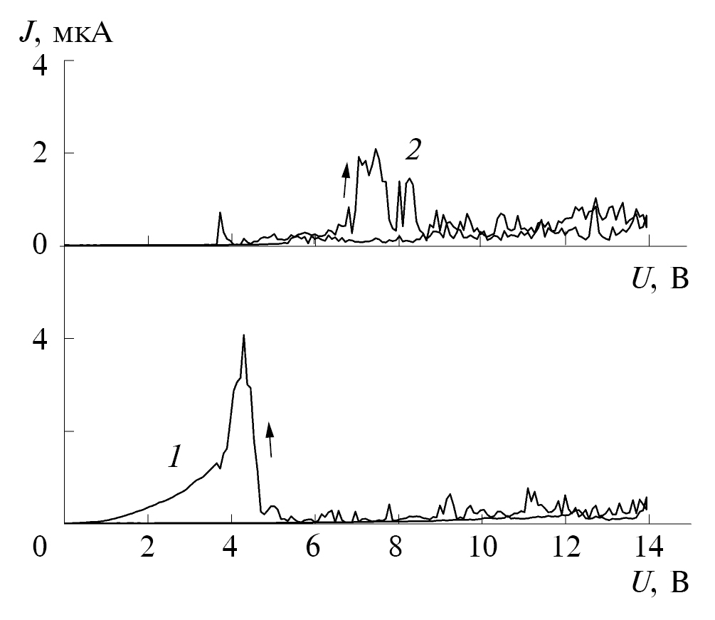 Рис. 4. Характерные квазистатические ВАХ открытых “сэндвич”-структур TiN–SiO2–W в “безмасляном” вакууме после их отжига (200°С, 60 мин в “безмасляном” вакууме, первая стадия электроформовки). Скорость изменения напряжения 2 В/с. Проходы напряжения до 14 В: 1 — первый; 2 — третий.