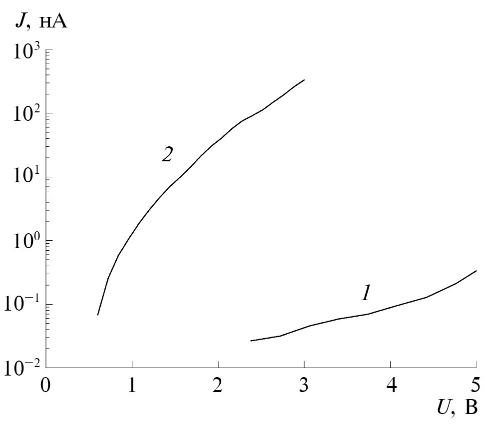 Рис. 6. Характерные начальные токи (до образования частиц проводящей фазы) в открытых “сэндвич”-структурах: 1 — TiN–SiO2–W; 2 — TiN–SiO2–Mo. Скорость изменения напряжения 2 В/с.