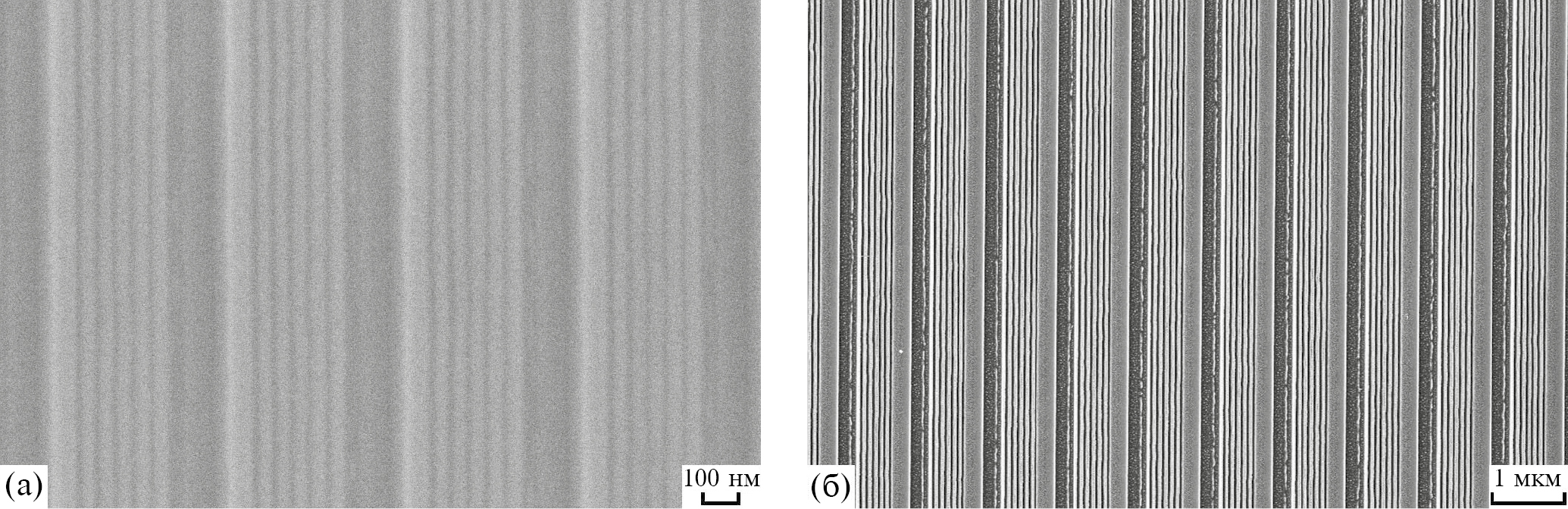 Рисунок из идеально прямых линий получается в результате многостадийного процесса с использованием литографически формируемых линейных кремниевых мез с резкими границами. Периодическую планарную структуру из чередующихся линий кремния (Si) и оксида кремния (SiO2) создавали посредством химико-механического полирования (кремниевые мезы отделяли канавками, заполненными SiO2). Плоскость ионной бомбардировки устанавливают перпендикулярно протяжению кремниевых мез. Направление проекции потока ионов на поверхность циклически меняется на противоположное на последующих стадиях. За счет граничных условий на прямолинейных краях мез возможно образование до шести–семи волн (делитель размера мезы). Для мезы заданной ширины ω первоначальная оценка периода λ заключается в делении ω на требуемое число волн: λ = ω/N. Оптимальную длину волны для каждой мезы и число волн N подбирали в экспериментах. Углы бомбардировки составляли θ = 40°–45°. Количество одинаковых по времени стадий распыления варьировалось от 10 до 20. Кремниевые наноструктуры, полученные при помощи процессов жидкостного и сухого травления кремния через наномаски, изготовленные в многостадийном процессе, с параллельными линиями в мезах протяженностью 350 мкм представлены на рис. 3. Наномаска с периодом λ = 50 нм, подвергнутая изотропному травлению в растворе (65 об.% HNO3)/(49 об. % HF) = 250/1, получена из мезы шириной около 300 нм (рис. 3а). Наномаска с периодом λ = 80 нм, подвергнутая реактивному ионному травлению в хлорной плазме на глубину 150 нм, получена из мезы шириной около 500 нм (рис. 3б). В обоих случаях в мезах получено N = 6 волн.