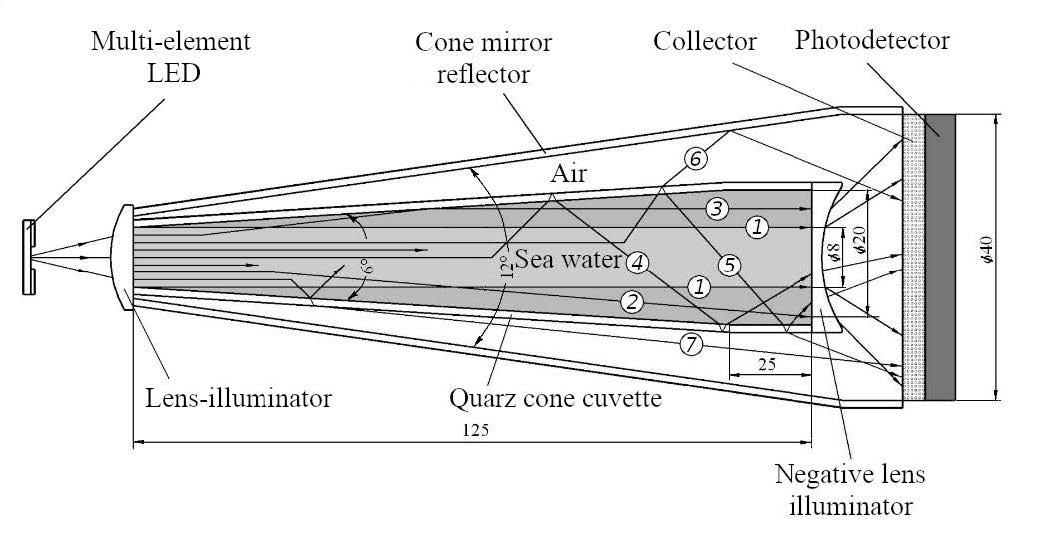 The path of rays in a cone cuvette is characterized by the fact that for a light flux directly passing through an aquatic medium, everything happens in the same way as in a cylindrical cuvette. However, in a quartz cone cuvette, significantly more photons scattered at small angles reach the collector without contacting the walls. Due to this, the cuvette wall influence on determining light absorption in the sea is reduced, since in natural waters scattering occurs mainly in small angles and almost all of them are redirected to the collector without interacting with the walls.