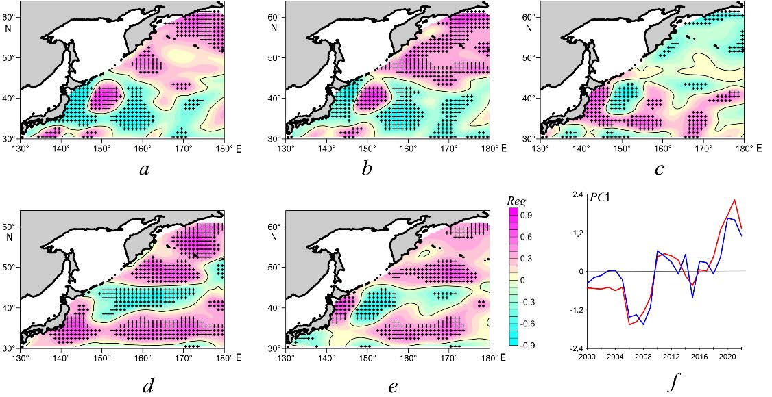Variations in the main EOF modes of geopotential anomalies (ΔH500) in the region are closely related to fluctuations in ocean surface temperature, wind field, different climate indices and changes in atmospheric circulation in the region [19]. Thus, their fluctuation connectivity is characterized by correlation coefficient R = – 0.8 with multidirectional trends in interannual changes in PC1(ΔH500) and NPGO. At the same time, the Aleutian Low weakening and strengthening of anticyclonic conditions are accompanied by the NPGO weakening, which can be seen in the current field (Fig. 1, c) and in the distribution of corresponding regression coefficients (Fig. 4, a).
