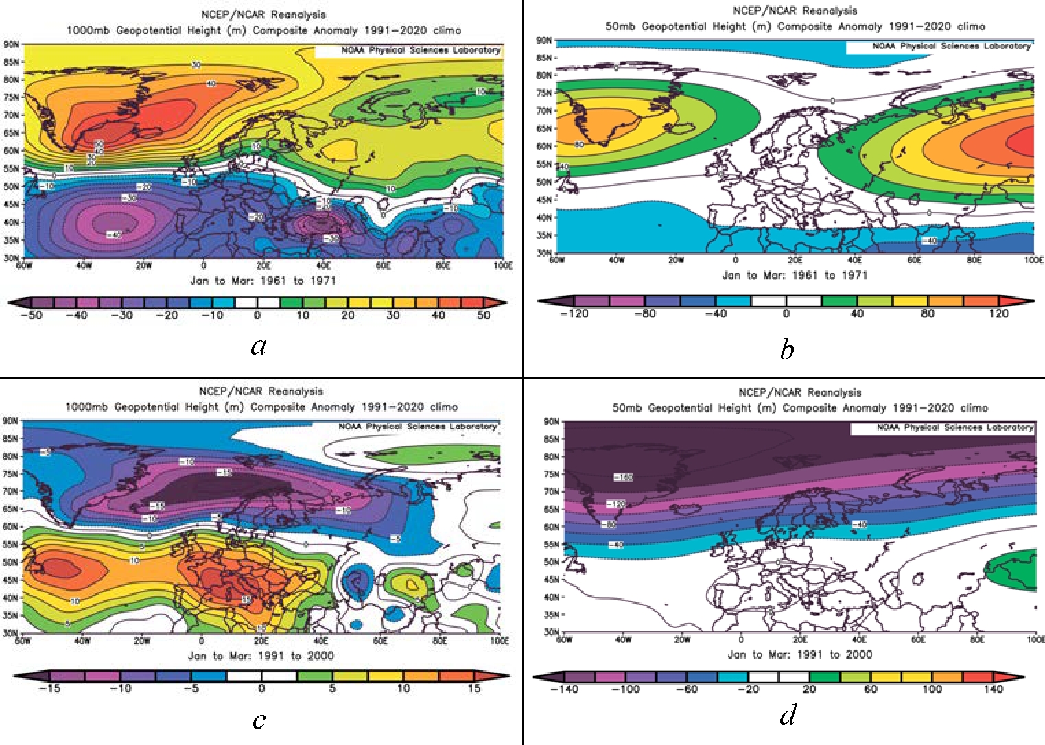 F i g. 2. Composite maps of the geopotential height anomalies at H1000 (a, c) and H50 (b, d) during the decade (1961–1970) of the NAO index negative phase (a, b) and the decade (1991–2000) of its positive phase (c, d)