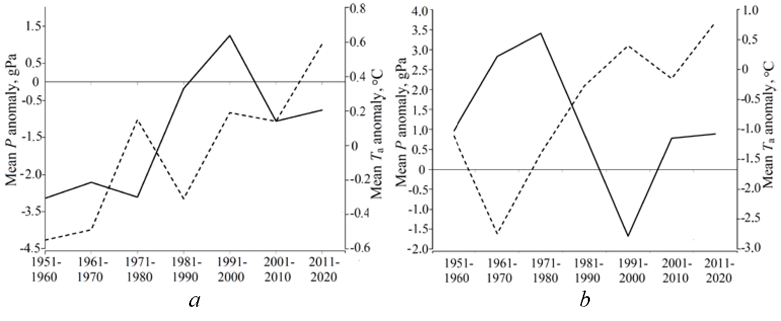 The western subregion was in the area of negative surface pressure anomaly (it corresponds to the area of negative geopotential height anomaly at the H1000 level in Fig. 2, a) in the decade of NAO index negative values (Fig. 4, a). The eastern subregion (Fig. 4, b) was located in the area of positive surface pressure anomaly (it corresponds to the area of positive geopotential height anomaly at the H1000 level in Fig. 2, a). Atmospheric processes in this subregion were influenced greatly by the Siberian anticyclone.