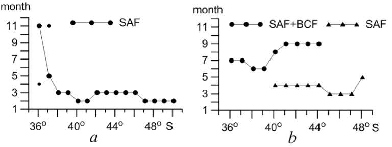 South of the Brazil – Falkland Confluence up to approximately 40°S, where the SAF+BCF front is the boundary between the cold and warm waters carried by these currents, it intensifies in June – July when the 11–12 °C isotherms in the tongue of cold waters are shifted maximally to the north (Figs. 6, d; 7, a; 8, a, c). South of 40°S, where the SAF+BCF serves as the western boundary of the warm water tongue separating them from the colder waters carried by the FRC, it intensifies in August – September (Figs. 6, b, c; 7, b). During this period, maximum cooling of surface waters is observed and the 15–17 °C isotherms in the tongue of warm waters are shifted maximally to the north (Figs. 8, b, c). Front strengthening is due to the fact that in August – September the temperature of the waters carried by the FRC does not exceed 9–10 °C while the SST values in the tongue of warm waters, despite the general cooling, remain higher and amount to 11–15 °C (Fig. 4, c). The Subantarctic Front which is located west of the SAF+BCF and separates the waters carried from the north by the FRC from even colder waters carried from the south by the FC intensifies in March – April (Figs. 6, b, c; 7, b). During this period, cooling of surface waters begins, especially pronounced in the cold tongue. According to the isotherms of 9–12 °C, its boundary shifts to the north by almost 500 km in April (Figs. 8, a, c) while the waters coming from the north with the FRC are still noticeably warmer at this time (SST values > 13–15 °C). Note that the SAF intensifies on the eastern periphery of the meander approximately a month later than on the western one (Fig. 7). According to an earlier work [7], at the eastern boundary of the cyclonic meander south of 42°S, the SAF intensified in May – June, i.e. the delay in the onset of the maximum compared to the western periphery was almost half a year. Analysis of the intra-annual course of the temperature change rate ΔSST (difference between the SST values of the current and previous months) showed that a similar phase delay of one month was observed at the onset of the maximum rate of water cooling west and east of the SAF at the western and eastern peripheries of the meander, respectively (Fig. 8, d). The maximum rate of water cooling (ΔSST ~ −2.5 °C) at the western periphery of the meander is observed in April, at the eastern periphery – a month later, in May.