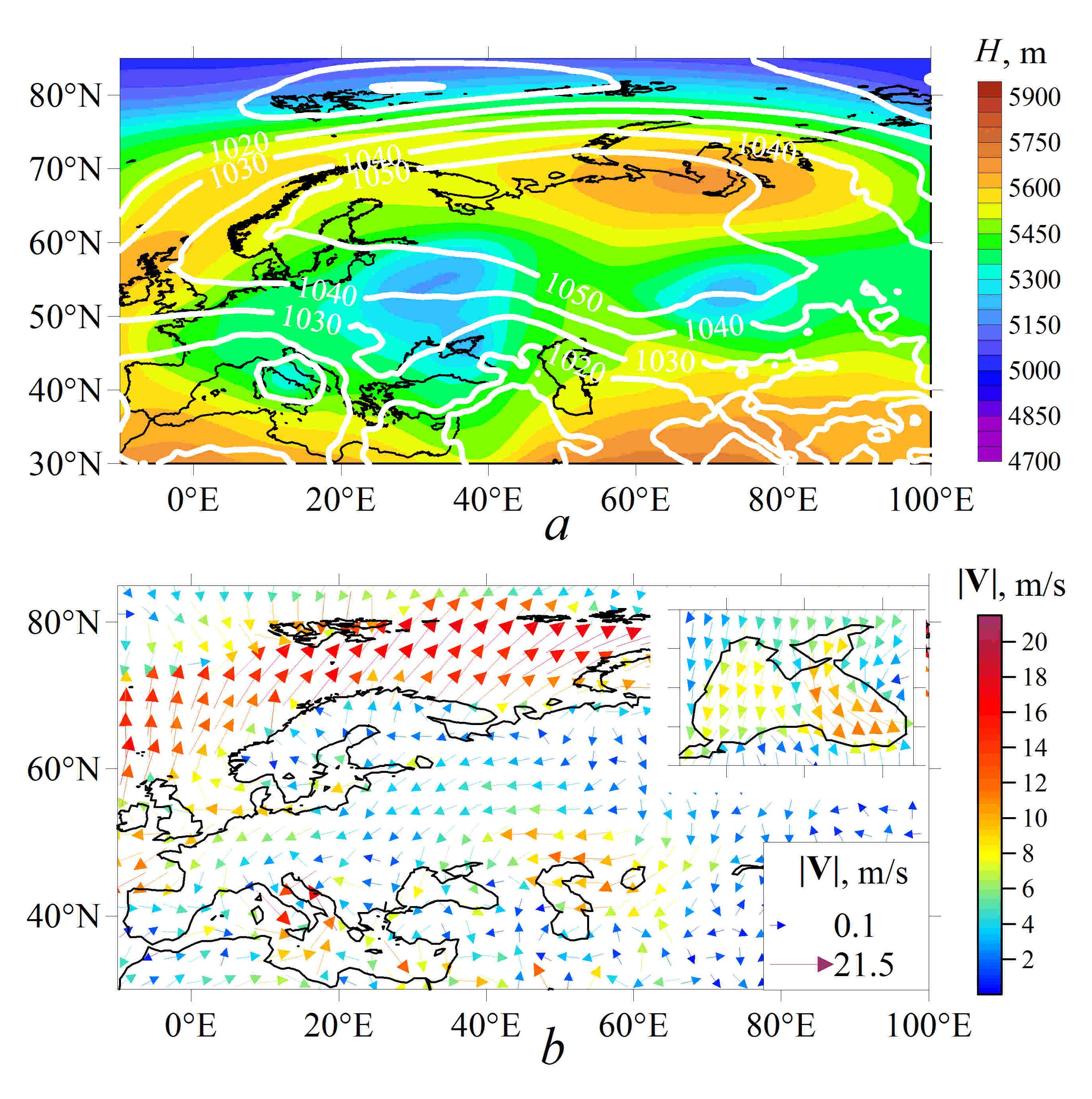 Since mid-January, a typical westerly movement of Atlantic cyclones over Central Europe was disrupted due to the strengthening of the Siberian anticyclone ridge, stretching from the south of the Urals, its subsequent movement to the north-west and merging with the high-altitude ridge over the north-eastern Atlantic [39, 40]. An extreme increase in positive surface pressure anomalies took place in the lower layer of the troposphere [41]. By the end of January – early February, an extensive high-altitude blocking anticyclone was located in the north of the European part of Russia (Fig. 3, a). At the Black Sea coast, frosts were accompanied by strong winds (Fig. 3, b). During the period under review, from 29 January to 2 February 2012, a northerly wind blew over the Black Sea with a mean speed of 7.4 m/s and maximum values of up to 15 m/s.