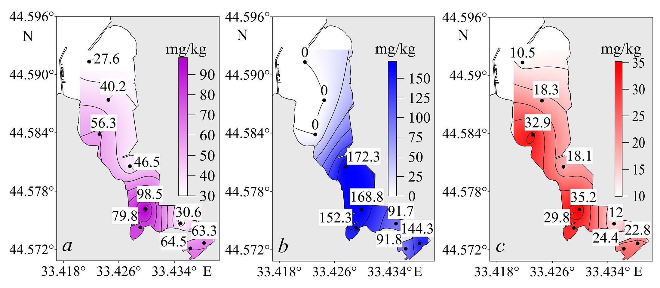 Fig. 3. Spatial distribution of hydrocarbons (a), UCM (b), and n-alkanes (c) in the bottom sediments surface layer of Kamyshovaya Bay