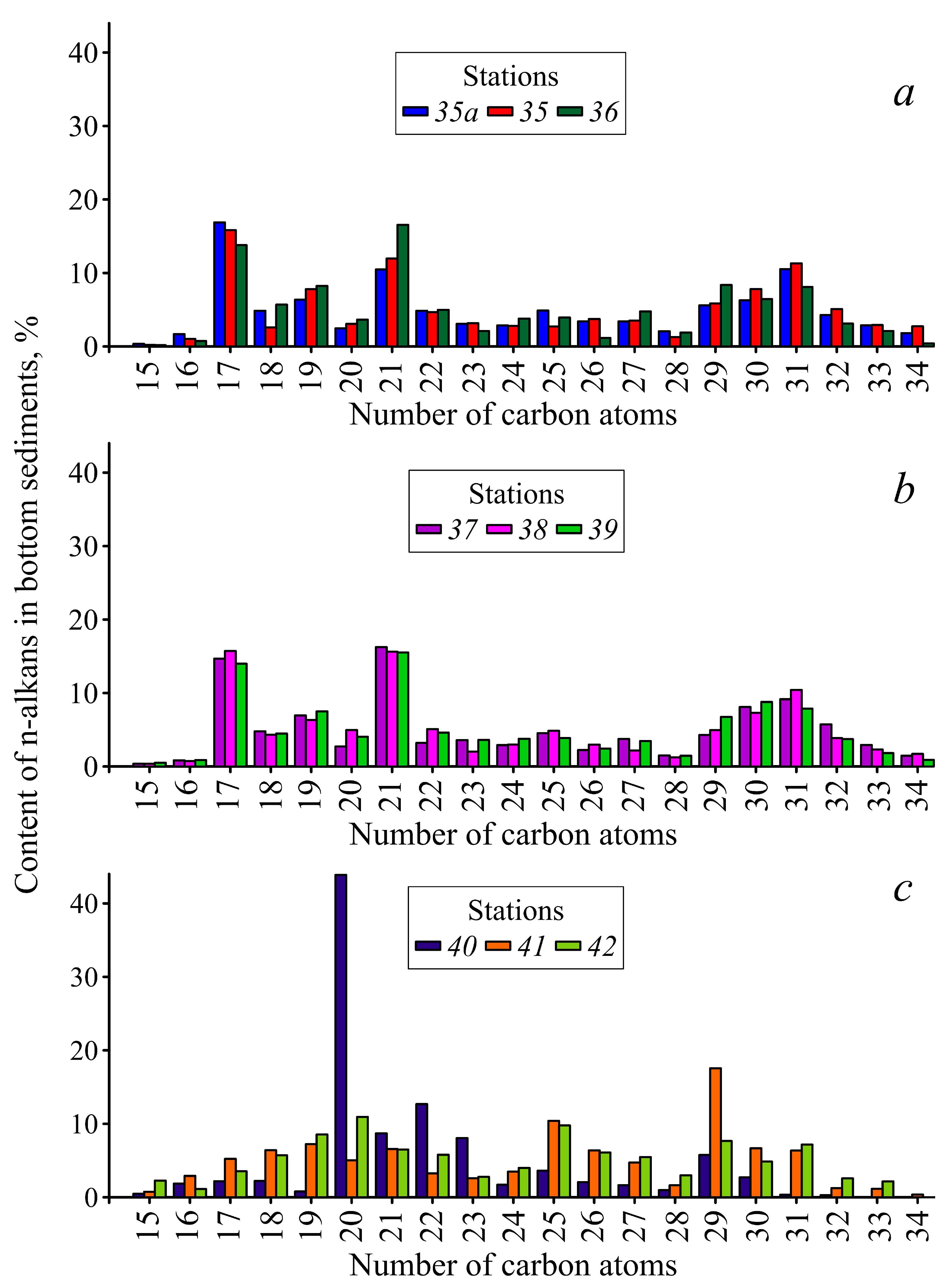 Fig. 5. Composition of n-alkanes in the surface layer of bottom sediments in Kamyshovaya Bay by stations: a – 35a, 35, 36; b – 37, 38, 39; c – 40, 41, 42