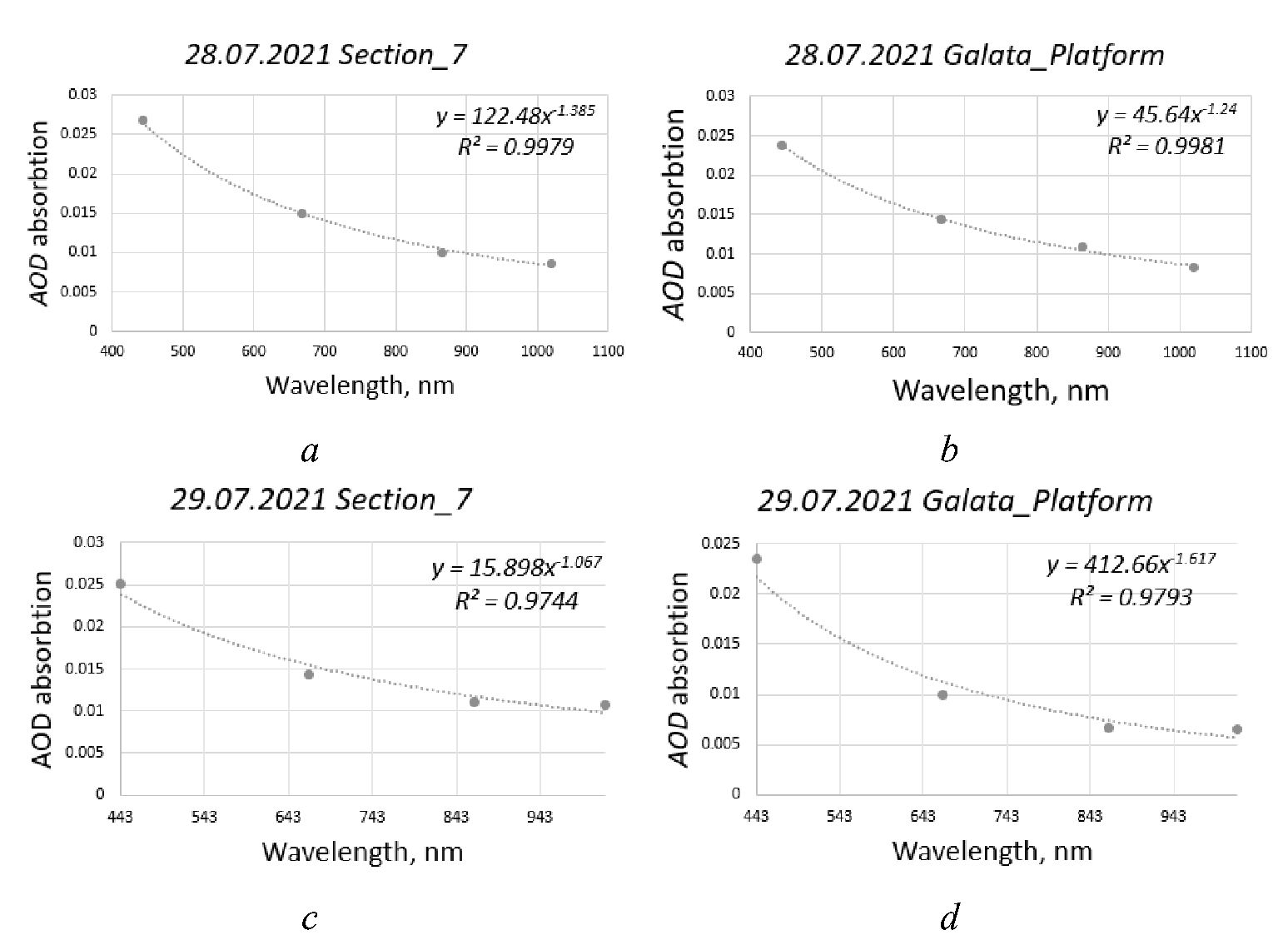 Fig. 3. Mode of the power function of aerosol absorption optical depth at Galata_Platform (а) and Section_7 (b) for 28 July 2021, and at Galata_Platform (c) and Section_7 (d) for 29 July 2021