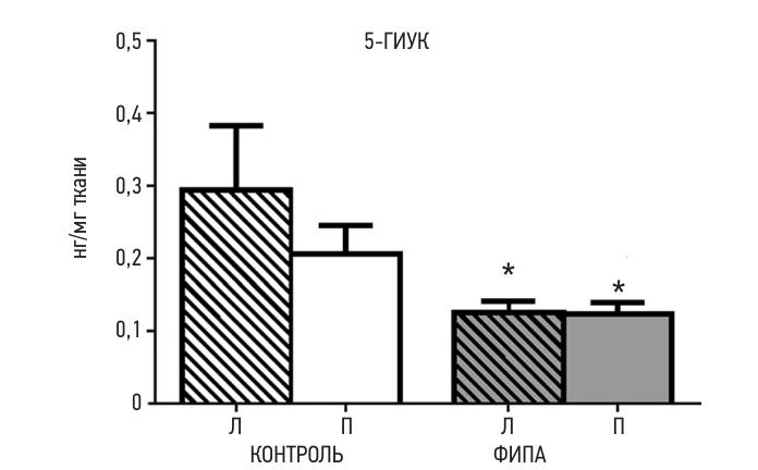 Рис. 3. Изменение уровня 5-гидроксииндолуксусной кислоты (5-ГИУК) в префронтальной коре под действием β-фенилизопропиламина. Группы животных: контроль — получавшие физиологический раствор, ФИПА — получавшие β-фенилизопропиламин. Заштрихованными столбиками (Л) показано значение соответствующего параметра в левом полушарии, незаштрихованными (П) — в правом. *p < 0,05 — достоверные отличия от соответствующего показателя, измеренного у интактных животных по t-критерию Стьюдента