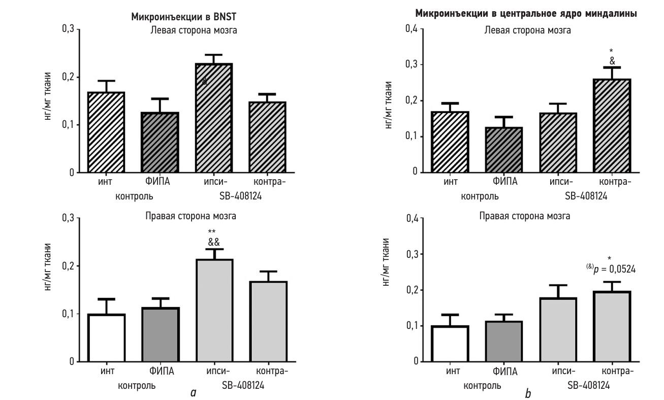 Результаты. На фоне ФИПА микроинъекции SB-408124 в правое центральное ядро миндалины вызывали следующие эффекты: в префронтальной коре — повышение уровня ГВК и 5-ГТ справа, а 5-ГИУК — слева; в гиппокампе — билатеральное возрастание содержания НА и ГВК, а 5-ГТ — справа; в стриатуме — билатеральное повышение уровня ДА и левостороннее повышение ГВК, 5-ГТ и 5-ГИУК. Микроинъекции в левое центральное ядро миндалины вызывали: в стриатуме — правостороннее снижение уровня НА и возрастание 5-ГТ, а также левостороннее снижение уровня ДА и ДОФУК; в обонятельном бугорке — левостороннее повышение ГВК. Микроинъекции в правое BNST вызывали: в префронтальной коре — левостороннее снижение уровня НА и ДА, в стриатуме — билатеральное снижение уровня ДОФУК, правостороннее повышение 5-ГТ и левостороннее — 5-ГИУК; в обонятельном бугорке — левостороннее повышение уровня ГВК. Микроинъекции в левое BNST вызывали в левом стриатуме повышение уровня 5-ГТ; в левом обонятельном бугорке — снижение уровня ДОФУК и 5-ГИУК.