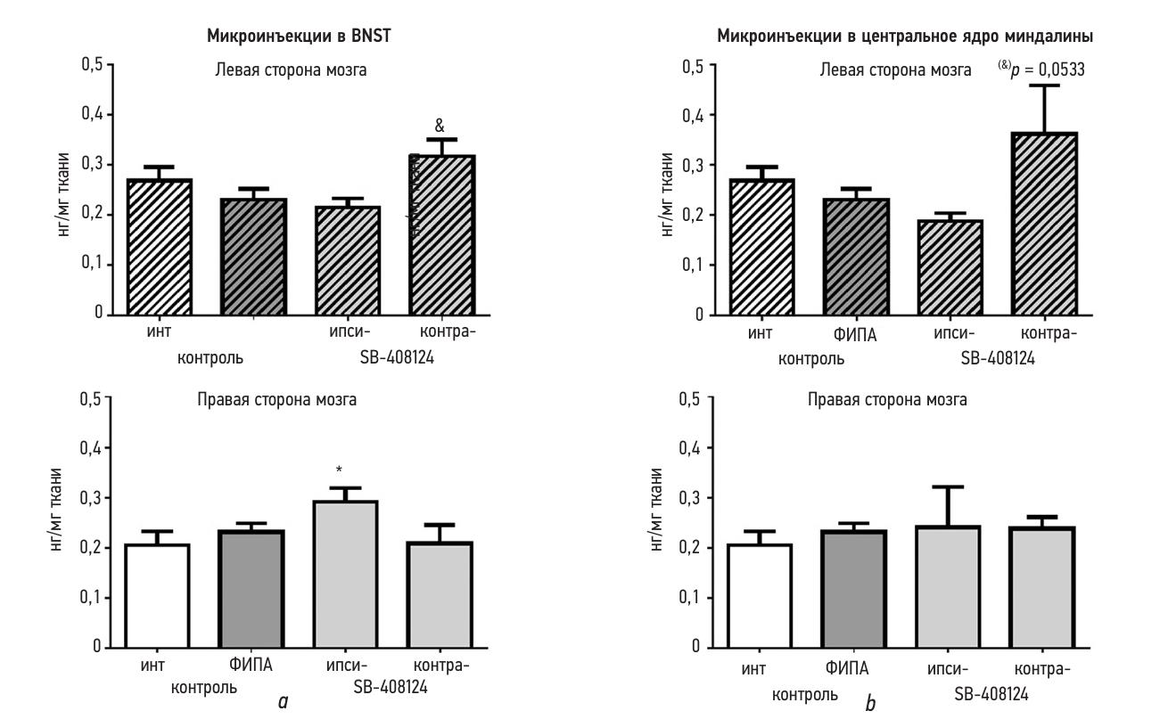 Заключение. Правосторонние микроинъекции вызывают большее число изменений показателей обмена моноаминов, чем левосторонние. Введение SB-408124 в правые структуры расширенной миндалины увеличивает содержание 5-ГИУК в левом стриатуме, при этом микроинъекции в BNST приводят к возрастанию уровня 5-ГТ в ипсилатеральном стриатуме, а в центральное ядро миндалины — в контралатеральном.