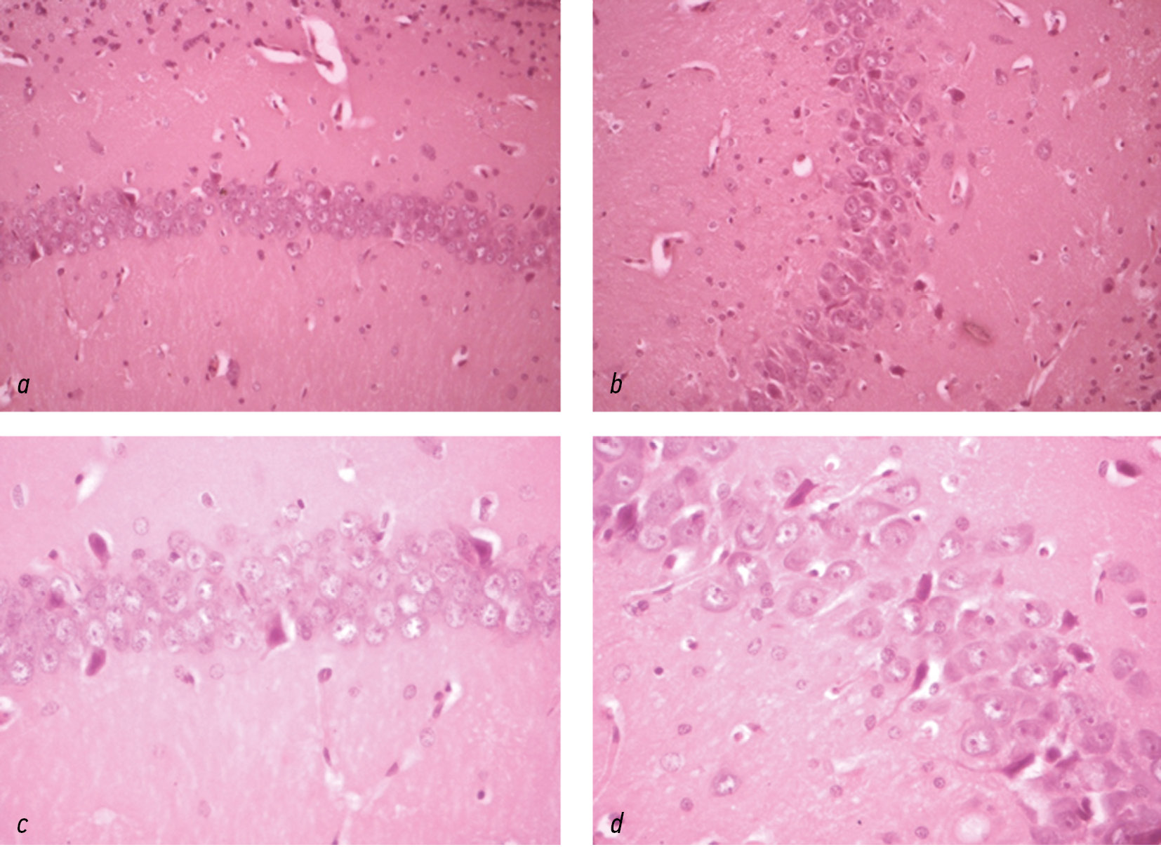 Fig. 2. Zones CA1 (a, c) and CA3 (b, d) of the hippocampus of the rat brain (combined preconditioning with amtizol, early period). The histoarchitecture can be traced, the cellularity is relatively preserved, and there is pronounced perivascular and, in some places, pericellular edema. Both zones: single normal neurons are found (more in the CA3 field); hyperchromic neurons are present. CA1 field: shadow cells and hypochromic neurons are detected; macroglia are partially preserved; capillaries are identified, but their endothelium is absent in places; single microglial cells appear. Hematoxylin–eosin staining. Magnification for a, b × 200, for c, d × 400