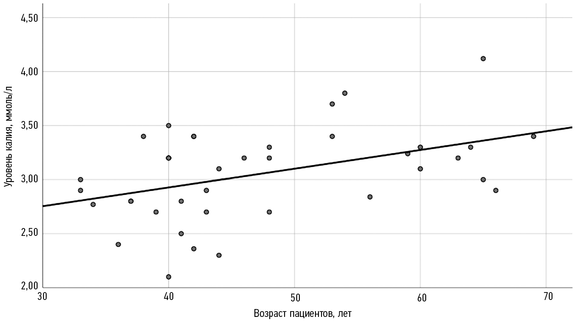 Рис. Зависимость уровня калия от возраста у пациентов с алкогольным делирием