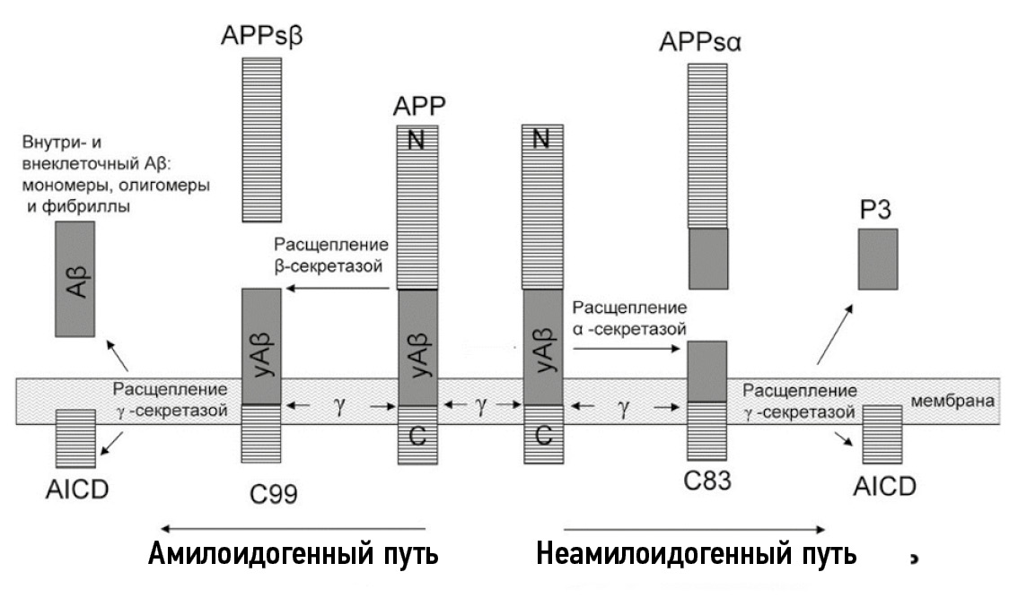 Амилоидные бляшки в тканях мозга пациентов с БA состоят из агрегированных фибрилл, состоящих из Aβ. Показано, что амилоид Aβ образуется из белка — предшественника амилоида (APP) путем его последовательного протеолитического расщепления (рис. 1). В амилоидном пути β-секретаза расщепляет предшественника амилоида APP внеклеточно с высвобождением sAPPβ и связанного с мембраной фрагмента C99, который впоследствии расщепляется γ-секретазой с высвобождением Aβ и внутриклеточного домена AICD с его последующей транслокацией в ядро [127]. По неамилоидному пути амилоидный предшественник АРР расщепляется α-секретазой с высвобождением sAPPa и связанного с мембраной фрагмента C83 (APP-CTF) [24]. Затем C83 расщепляется γ-секретазой с высвобождением субъединиц Р3 и AICD.