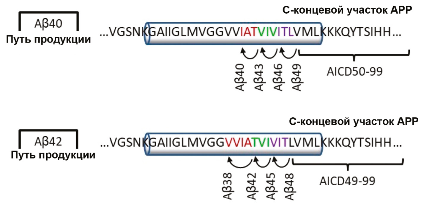 Однако уже на ранних этапах изучения патогенгеза БА было установлено, что основную роль в формировании амилоидных бляшек играет амилоидогенный путь расщепления АРР [43, 65, 133]. Обычно этот процесс называют γ-секретазным расщеплением АРР с высвобождением амилоидных пептидов Aβ40, Aβ42, P3 и AICD. Сайт расщепления γ-секретазой может быть дополнительно разделен на сайты γ-, ζ- и ε-расщепления [162]. γ-Сайт заканчивается на олигомерах Aβ40 или Aβ42, а AICD начинается на олигомерах Aβ49 или Aβ50. Это несоответствие с отсутствующими аминокислотными остатками привело к новой идентификации сайта ε-расщепления в Aβ49 [58, 125, 154, 163].