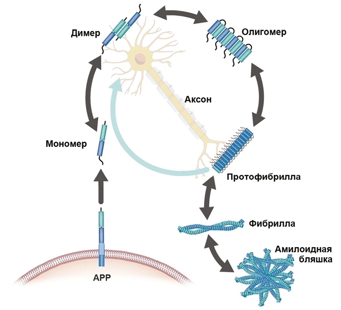 Согласно гипотезе амилоидного каскада, накопление амилоида Aβ в тканях головного мозга является основной причиной развития БA. Хронический дисбаланс между выработкой и скоростью выведения амилоидов Aβ приводит к повышению уровня изоформ Aβ42 с последующей олигомеризацией Aβ, образованием фибрилл и накоплением амилоида в бляшках [61]. Как олигомеры Aβ, так и амилоидные бляшки повреждают нейроны путем активации астроцитов, окислительного повреждения митохондрий и изменения активности киназы/фосфатазы с последующим образованием нейрофибриллярных клубков [61].