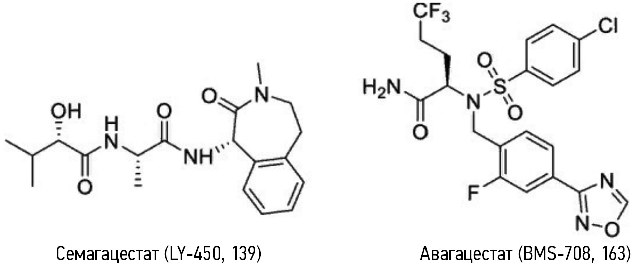 В исследованиях на животных было показано, что ингибиторы γ-секретазы успешно снижали выработку Aβ. В частности, ингибитор DAPT снижал уровни Aβ в плазме, ликворе или в тканях головного мозга трансгенных мышей с БA [39, 86]. Продолжительное (хроническое) лечение ингибитором LY-411,575 трансгенных мышей с БA понижало уровень амилоидов Aβ, одновременно с этим ингибировалась передача сигналов Notch, что вызывало побочные эффекты [157]. Однако введение семагацестата (LY-450,139) и авагацестата (BMS-708,163) мышам фенотипа Tg2576 вызывало снижение продукции Aβ при одновременном увеличении образования фрагментов APP-CTF [120]. Введение этих ингибиторов мышам дикого типа нарушало их нормальные когнитивные способности [102], однако введение бегацестата (GSI-953) мышам фенотипа Tg2576 снижало у них уровень Aβ [99].