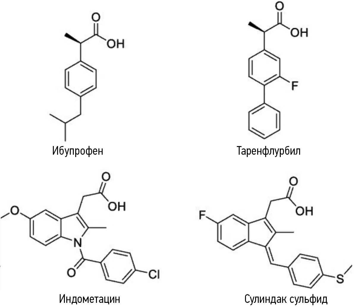В результате таких исследований было обнаружено, что нестероидные противовоспалительные препараты (НПВП), такие как ибупрофен, индометацин и сульфид сулиндака, модулируют активность γ-секретазы и представляют собой модуляторы первого поколения [102]. Они понижали уровень производства пептидов Aβ42 и повышали уровень производства пептидов Aβ38, не влияя на расщепление Notch [153]. Установлено, что эта модуляция амилоидов Aβ не была обусловлена ингибированием активности циклооксигеназы, известной фармакологической мишени препаратов НПВП [153]. При лечебном применении сульфида сулиндака была показана различная степень снижения уровня амилоида Aβ42 при одновременном увеличении повышенных уровней Aβ38 в клетках, сверхэкспрессирующих мутантный пресенилин PS1 семейной БA [111].