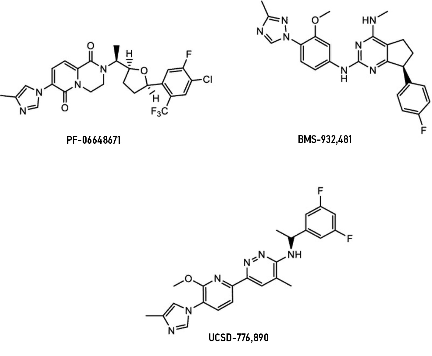 Гетероциклические модуляторы снижают уровни Aβ40 и Aβ42, одновременно повышая уровни Aβ37 и Aβ38. E2012 стал первым не относящимся к НПВП модулятором, испытания которого были проведены в клинических условиях.