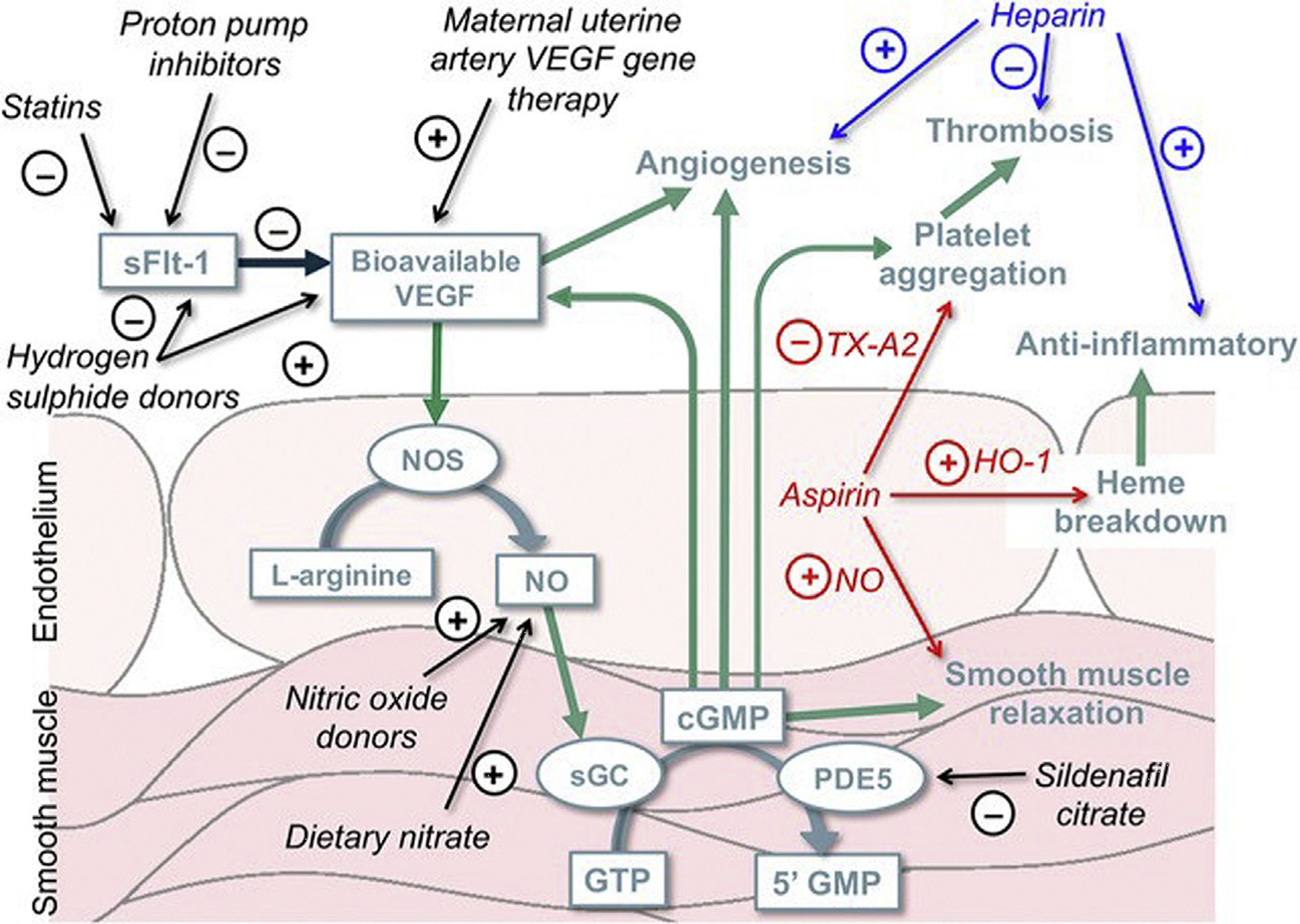 Маточно-виллярный кровоток с сохраненной функцией гладкомышечных клеток спиральных артерий, особенно при раннем начале ЗРП, по-видимому, является преобладающим патофизиологическим путем [54]. Это неоптимальное ремоделирование маточных спиральных артерий привело к разработке фармакологических стратегий, которые влияют на маточно-плацентарную сосудистую функцию через эндотелиальный путь оксида азота и вазодилатацию, изображенную на рисунке 1 [55]. В настоящее время отсутствует стратегия с доказанной эффективностью относительно ведения ЗРП. Фармакологическое вмешательство особенно необходимо при тяжелом фенотипе раннего начала ЗРП, потому что любой вариант, который способен продлить беременность и уменьшить последствия недоношенности после ятрогенных родов, может оказать огромное влияние на перинатальные исходы.