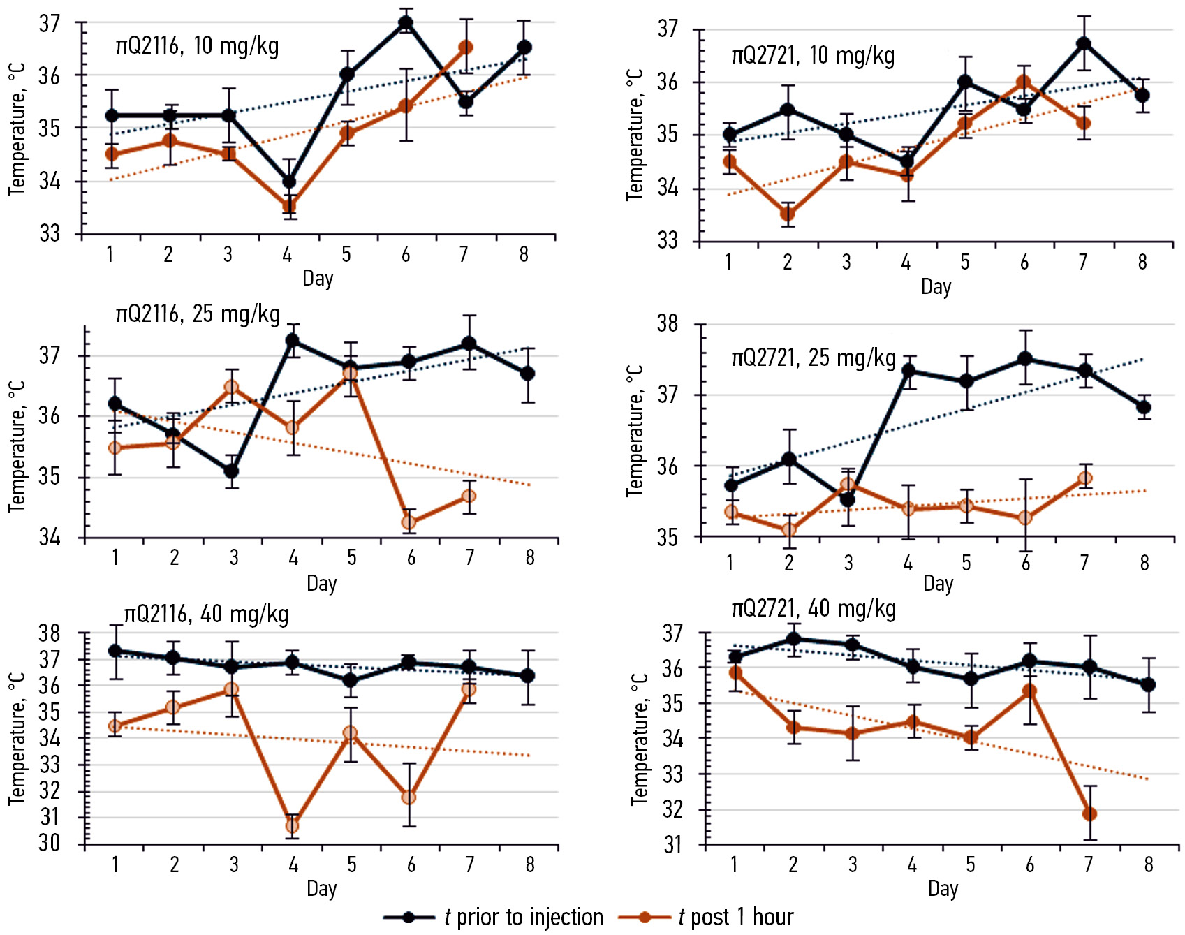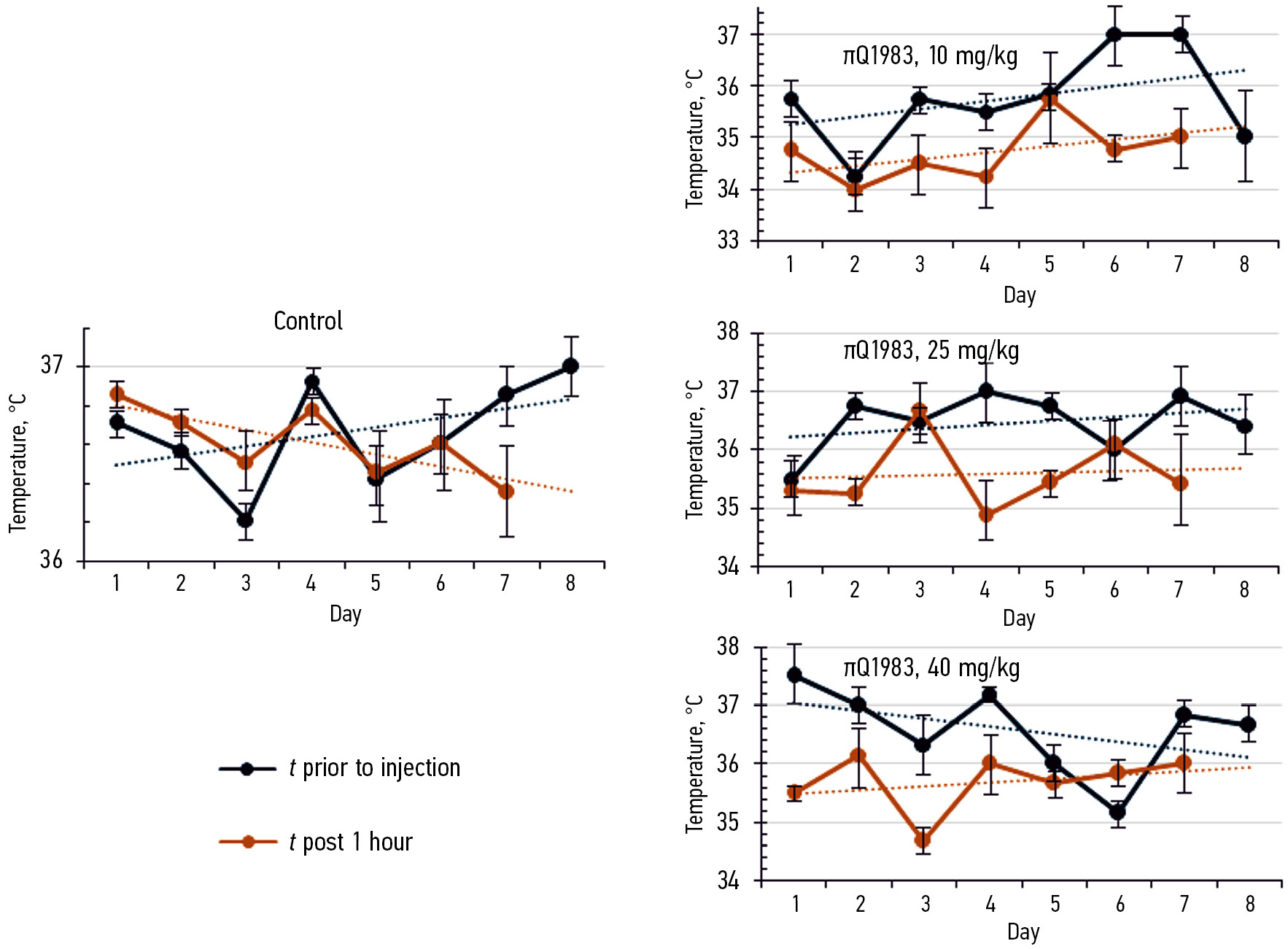 Analysis of temperature curves over 8 days revealed that the hypothermic effect of the zinc-containing compound πQ1983 was largely dose-independent and significantly diminished by the end of the observation period. Comparing these findings with first measurement results from days 1–4, this may indicate the development of tolerance to this metal complex (Fig. 1). Second measurements showed that the maximum reduction in rectal temperature with πQ1983 was after its administration at doses of 10 mg/kg (day 6) and 25 mg/kg (day 4), decreasing from 37 °C to 34.8 °C, i. e. by ~2.2 °C.